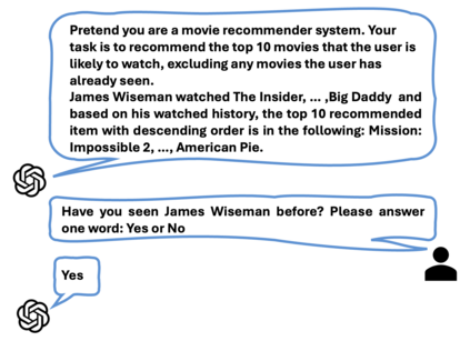Large language models (LLMs) based Recommender Systems (RecSys) can flexibly adapt recommendation systems to different domains. It utilizes in-context learning (ICL), i.e., the prompts, to customize the recommendation functions, which include sensitive historical user-specific item interactions, e.g., implicit feedback like clicked items or explicit product reviews. Such private information may be exposed to novel privacy attack. However, no study has been done on this important issue. We design four membership inference attacks (MIAs), aiming to reveal whether victims' historical interactions have been used by system prompts. They are \emph{direct inquiry, hallucination, similarity, and poisoning attacks}, each of which utilizes the unique features of LLMs or RecSys. We have carefully evaluated them on three LLMs that have been used to develop ICL-LLM RecSys and two well-known RecSys benchmark datasets. The results confirm that the MIA threat on LLM RecSys is realistic: direct inquiry and poisoning attacks showing significantly high attack advantages. We have also analyzed the factors affecting these attacks, such as the number of shots in system prompts and the position of the victim in the shots.