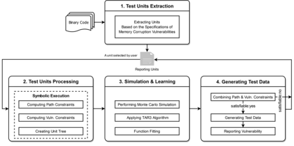 Memory corruption is a serious class of software vulnerabilities, which requires careful attention to be detected and removed from applications before getting exploited and harming the system users. Symbolic execution is a well-known method for analyzing programs and detecting various vulnerabilities, e.g., memory corruption. Although this method is sound and complete in theory, it faces some challenges, such as path explosion, when applied to real-world complex programs. In this paper, we present a method for improving the efficiency of symbolic execution and detecting four classes of memory corruption vulnerabilities in executable codes, i.e., heap-based buffer overflow, stack-based buffer overflow, use-after-free, and double-free. We perform symbolic execution only on test units rather than the whole program to avoid path explosion. In our method, test units are considered parts of the program's code, which might contain vulnerable statements and are statically identified based on the specifications of memory corruption vulnerabilities. Then, each test unit is symbolically executed to calculate path and vulnerability constraints of each statement of the unit, which determine the conditions on unit input data for executing that statement or activating vulnerabilities in it, respectively. Solving these constraints gives us input values for the test unit, which execute the desired statements and reveal vulnerabilities in them. Finally, we use machine learning to approximate the correlation between system and unit input data. Thereby, we generate system inputs that enter the program, reach vulnerable instructions in the desired test unit, and reveal vulnerabilities in them. This method is implemented as a plugin for angr framework and evaluated using a group of benchmark programs. The experiments show its superiority over similar tools in accuracy and performance.