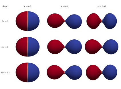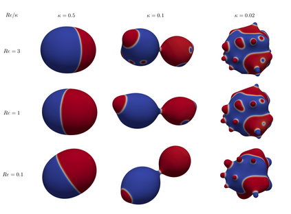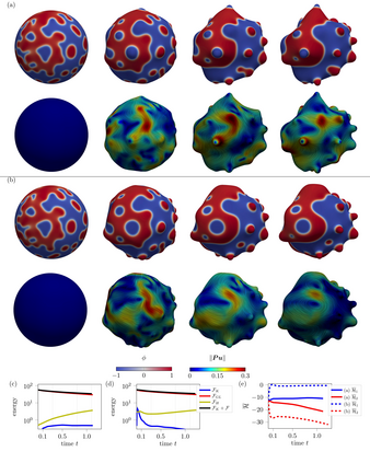 We consider two-phase fluid deformable surfaces as model systems for biomembranes. Such surfaces are modeled by incompressible surface Navier-Stokes-Cahn-Hilliard-like equations with bending forces. We derive this model using the Lagrange-D'Alembert principle considering various dissipation mechanisms. The highly nonlinear model is solved numerically to explore the tight interplay between surface evolution, surface phase composition, surface curvature and surface hydrodynamics. It is demonstrated that hydrodynamics can enhance bulging and furrow formation, which both can further develop to pinch-offs. The numerical approach builds on a Taylor-Hood element for the surface Navier-Stokes part, a semi-implicit approach for the Cahn-Hilliard part, higher order surface parametrizations, appropriate approximations of the geometric quantities, and mesh redistribution. We demonstrate convergence properties that are known to be optimal for simplified sub-problems.