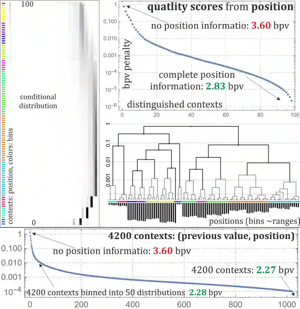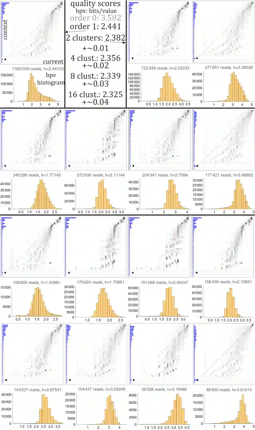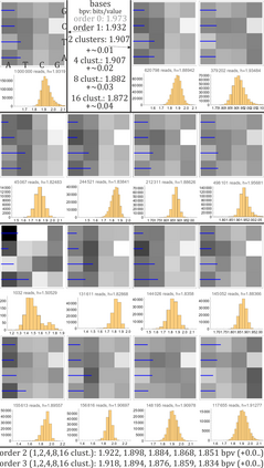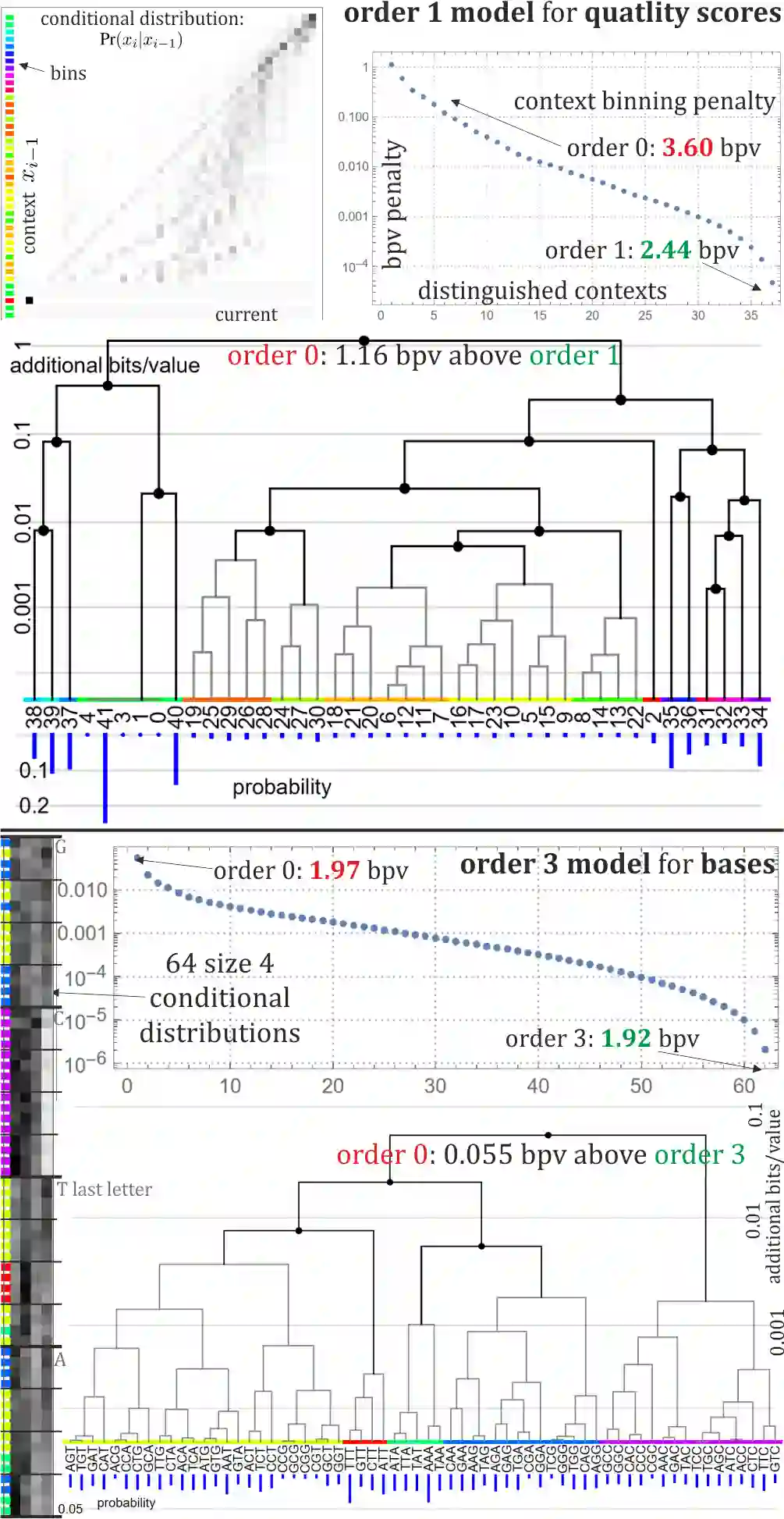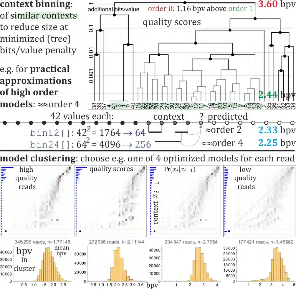 Rapid growth of genetic databases means huge savings from improvements in their data compression, what requires better inexpensive statistical models. This article proposes automatized optimizations e.g. of Markov-like models, especially context binning and model clustering. While it is popular to just remove low bits of the context, proposed context binning automatically optimizes such reduction as tabled: state=bin[context] determining probability distribution, this way extracting nearly all useful information also from very large contexts, into a relatively small number of states. The second proposed approach: model clustering uses k-means clustering in space of general statistical models, allowing to optimize a few models (as cluster centroids) to be chosen e.g. separately for each read. There are also briefly discussed some adaptivity techniques to include data non-stationarity.