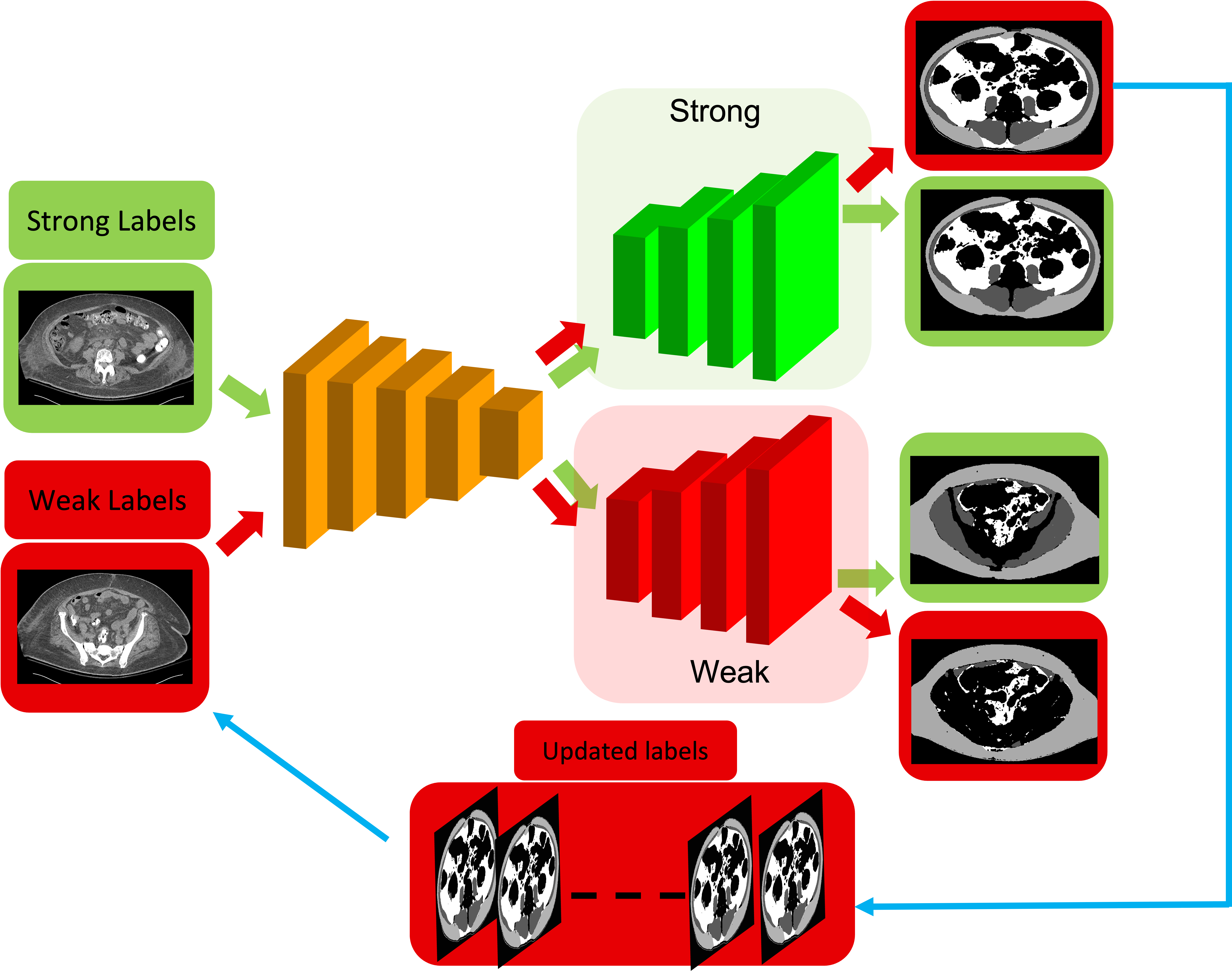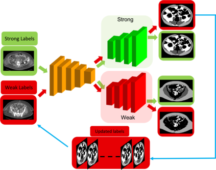 Accurate training labels are a key component for multi-class medical image segmentation. Their annotation is costly and time-consuming because it requires domain expertise. This work aims to develop a dual-branch network and automatically improve training labels for multi-class image segmentation. Transfer learning is used to train the network and improve inaccurate weak labels sequentially. The dual-branch network is first trained by weak labels alone to initialize model parameters. After the network is stabilized, the shared encoder is frozen, and strong and weak decoders are fine-tuned by strong and weak labels together. The accuracy of weak labels is iteratively improved in the fine-tuning process. The proposed method was applied to a three-class segmentation of muscle, subcutaneous and visceral adipose tissue on abdominal CT scans. Validation results on 11 patients showed that the accuracy of training labels was statistically significantly improved, with the Dice similarity coefficient of muscle, subcutaneous and visceral adipose tissue increased from 74.2% to 91.5%, 91.2% to 95.6%, and 77.6% to 88.5%, respectively (p<0.05). In comparison with our earlier method, the label accuracy was also significantly improved (p<0.05). These experimental results suggested that the combination of the dual-branch network and transfer learning is an efficient means to improve training labels for multi-class segmentation.