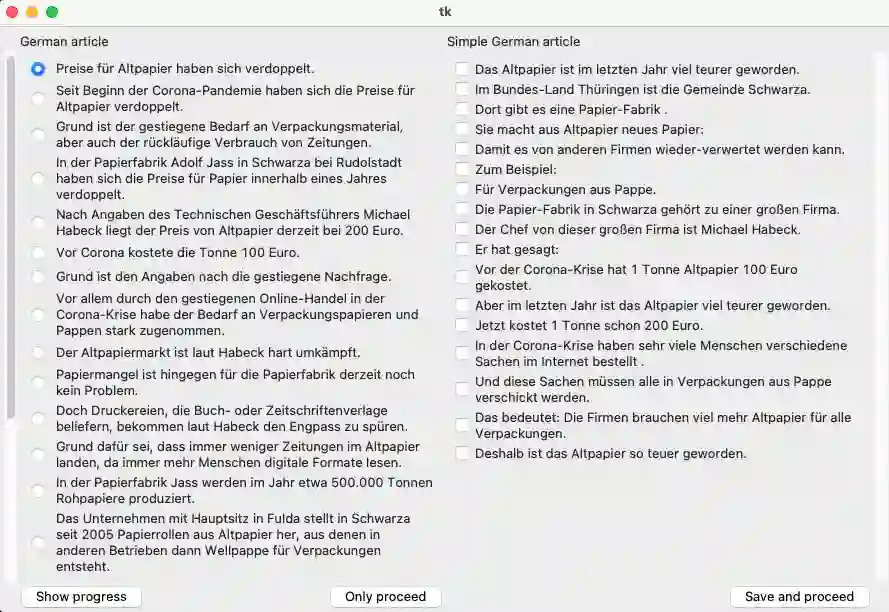 翻译:“Leiste Sprache”是德国与简单英文相对应的语言,是一种受管制的语言,目的是为复杂的书面语言提供便利,否则不同群体将无法进入该语言。我们为简单的德语(德语)提供了一个新的符合句式的单语程序。它包含多种符合文档的源码,我们用自动的量刑对齐方法对齐了。我们根据一个手工标注的统一文件子集来评估我们的校对。我们用F1分测量的句式对齐质量超过了以前的工作。我们根据CC BY-SA和根据MIT许可证发布的数据集和相应的代码。