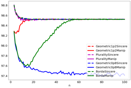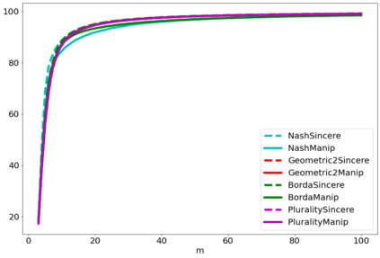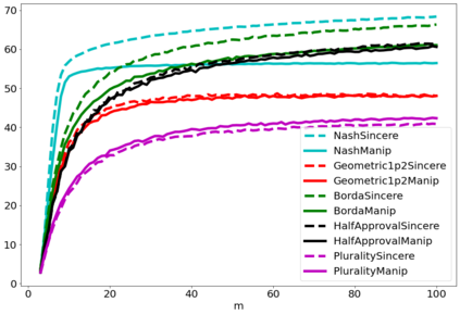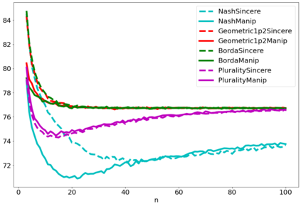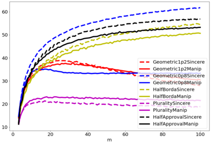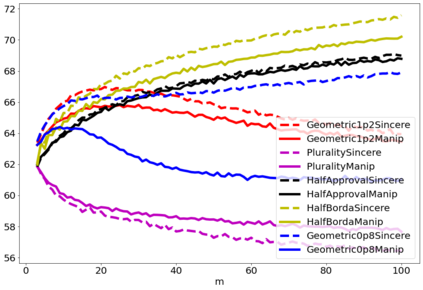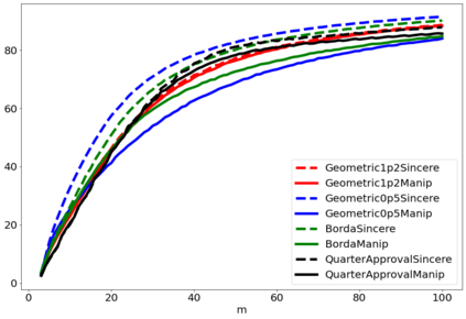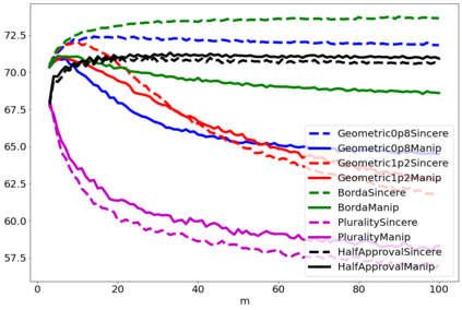 翻译:战略投票或操纵是选民歪曲其偏好的程序,以图选出他认为比真诚投票的结果更可取的结果。人们普遍同意操纵是选举的负面特征,在评估投票规则易受操纵的脆弱性方面已经付出了大量努力。然而,为什么操纵实际上是坏的,这个问题不太常见。衡量操纵对结果的影响的方法之一是将真诚行为下的社会福利数量与有操纵者在场的真诚行为中的社会福利数量相比较。在这份文件中,我们进行了数字实验,以评估根据评分规则操纵对社会福利的影响。我们发现操纵通常是负面的,在大多数情况下,操纵者的最佳规则不同于有诚实选民的规则。