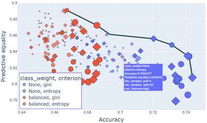 翻译:虽然机器学习(ML)在高风险决策领域中具有潜在优势,但ML的部署对从业人员来说并不可接受,存在歧视的风险。 在这些领域建立对ML的信任和接受,民主化ML工具和考虑公平性至关重要。 在本文中,我们介绍了FairPilot,一个交互式系统,旨在通过探索各种模型、不同超参数和各种公平性定义的组合来促进ML模型的负责开发。 我们强调选择“最佳”ML模型的挑战,并演示了如何使用FairPilot选择一组评估标准,然后将模型和超参数的Pareto前沿线作为交互式地图显示给用户。 FairPilot是首个结合这些功能的系统,为用户负责选择其模型提供了独特的机会。