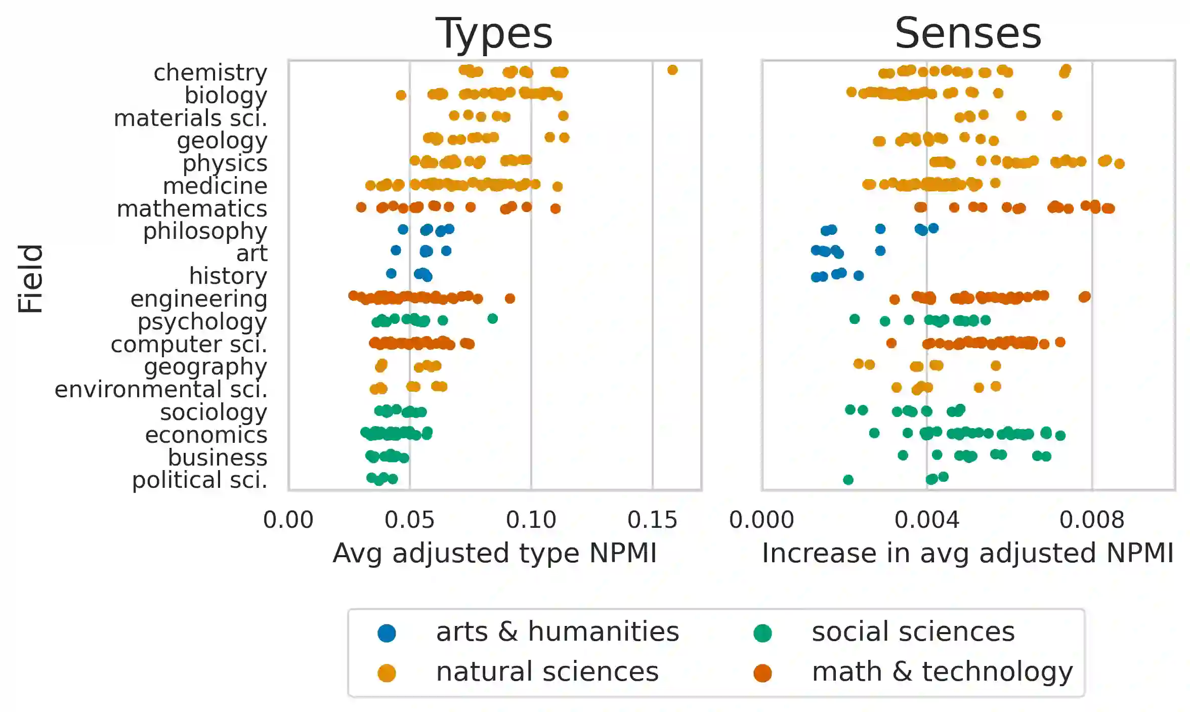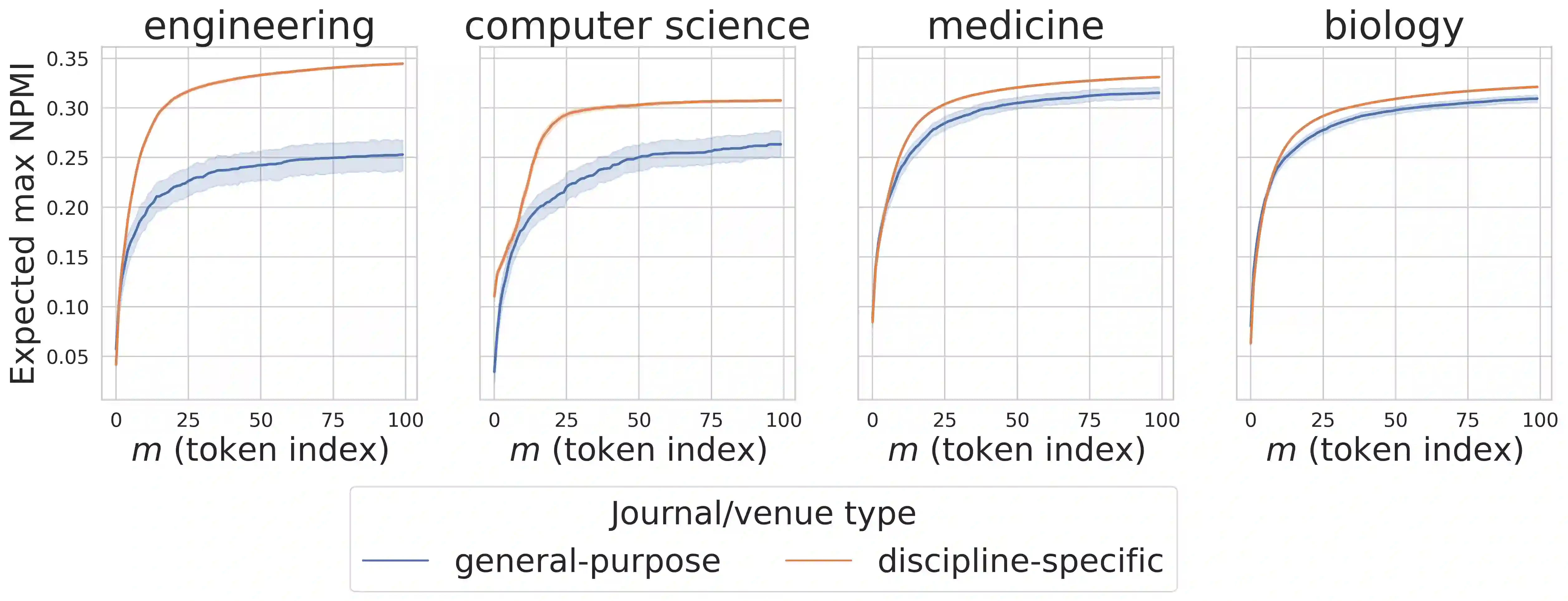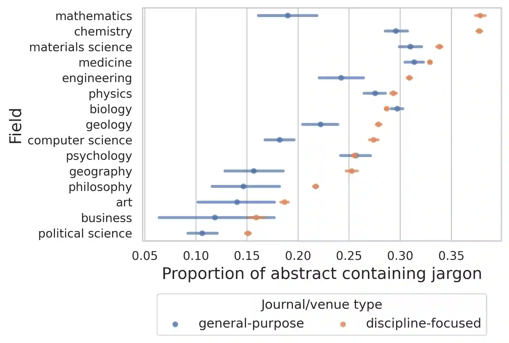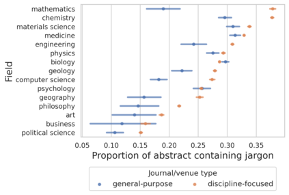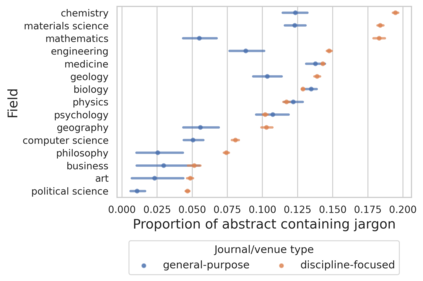 翻译:学术性文字往往用词典或专业语言来区分学科。 我们扩展过去科学在字型层面的特点, 使用基于 BERT 的字感感感感应, 寻找其他广泛但在不同领域使用过量的词汇。 我们将学术性词典定义为特定学科的字型和感应, 并使用可解释的信息理论度量来估计其在数百个领域的流行程度。 我们通过突出两个关键社会影响, 展示了我们科学学和计算社会语言学方法的实用性。 首先, 我们测量受众设计, 发现大多数领域在出版一般用途期刊时会减少术语, 但有些领域会比其他领域要多。 其次, 虽然术语与本领域文章的引用率有不同的相关性, 但几乎总是会阻碍跨学科影响。 广义上, 我们的测量可以告知如何修改语言作为桥梁而不是科学障碍。