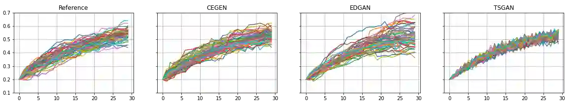 翻译:我们引入了三种新的时间序列遗传模型。 根据Euler离散和瓦塞斯坦度量, 它们能够捕捉时间边际分布和时间动态。 其中两种方法依靠基因对抗网络(GANs)适应时间序列。 这两种方法都通过在合成时间序列中捕捉基本时间结构而优于最先进的基准。 第三个算法称为“ 有条件电动生成器(CEGEN), 最大限度地缩小所有步骤的过渡概率分布之间的专门距离。 在Ito 进程中, 我们提供理论保证, 最大限度地减少这一标准意味着精确估计漂移和波动参数。 我们从经验上证明, CEGEN 超越了边际和时间动态指标上的最新和GAN 生成器。 此外, 它确定了高维度的准确关联结构。 当数据点很少时, 我们核查CEGEN的有效性, 与蒙特卡洛模拟的传输学习方法相结合。 最后, 我们用各种现实世界数据集展示了我们的方法的稳健性。