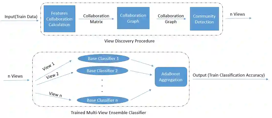 One of the most important problems in the field of pattern recognition is data classification. Due to the increasing development of technologies introduced in the field of data classification, some of the solutions are still open and need more research. One of the challenging problems in this area is the curse of dimensionality of the feature set of the data classification problem. In solving the data classification problems, when the feature set is too large, typical approaches will not be able to solve the problem. In this case, an approach can be used to partition the feature set into multiple feature sub-sets so that the data classification problem is solved for each of the feature subsets and finally using the ensemble classification, the classification is applied to the entire feature set. In the above-mentioned approach, the partitioning of feature set into feature sub-sets is still an interesting area in the literature of this field. In this research, an innovative framework for multi-view ensemble classification, inspired by the problem of object recognition in the multiple views theory of humans, is proposed. In this method, at first, the collaboration values between the features is calculated using a criterion called the features collaboration criterion. Then, the collaboration graph is formed based on the calculated collaboration values. In the next step, using the community detection method, graph communities are found. The communities are considered as the problem views and the different base classifiers are trained for different views using the views corresponding training data. The multi-view ensemble classifier is then formed by a combination of base classifiers based on the AdaBoost algorithm. The simulation results of the proposed method on the real and synthetic datasets show that the proposed method increases the classification accuracy.