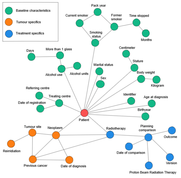 Cancer registries collect multisource data and provide valuable information that can lead to unique research opportunities. In the Netherlands, a registry and model-based approach (MBA) are used for the selection of patients that are eligible for proton therapy. We collected baseline characteristics including demographic, clinical, tumour and treatment information. These data were transformed into a machine readable format using the FAIR (Findable, Accessible, Interoperable, Reusable) data principles and resulted in a knowledge graph with baseline characteristics of proton therapy patients. With this approach, we enable the possibility of linking external data sources and optimal flexibility to easily adapt the data structure of the existing knowledge graph to the needs of the clinic.