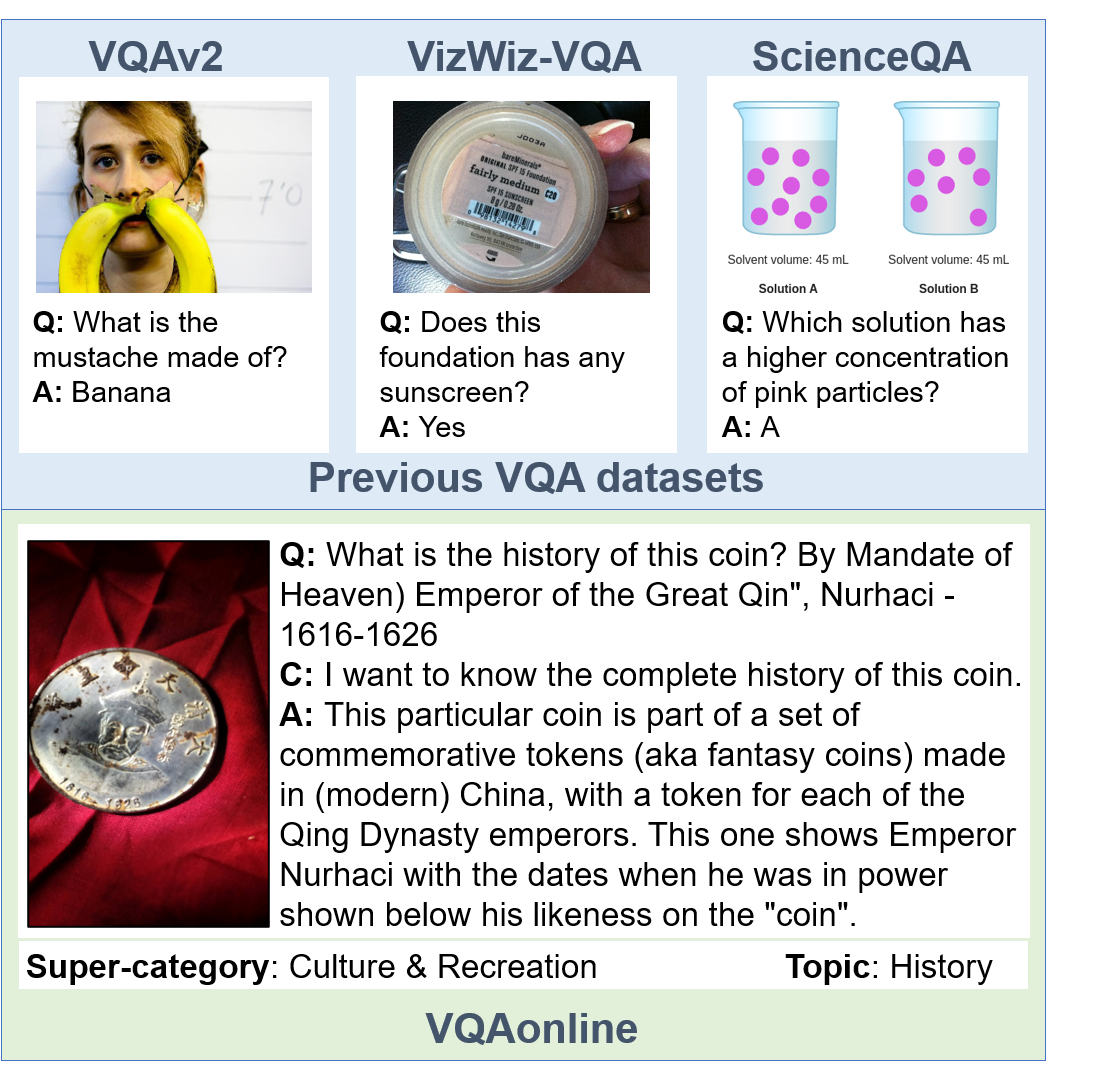 Visual Question Answering (VQA) entails answering questions about images. We introduce the first VQA dataset in which all contents originate from an authentic use case. Sourced from online question answering community forums, we call it VQAonline. We then characterize our dataset and how it relates to eight other VQA datasets. Observing that answers in our dataset tend to be much longer (e.g., with a mean of 173 words) and thus incompatible with standard VQA evaluation metrics, we next analyze which of the six popular metrics for longer text evaluation align best with human judgments. We then use the best-suited metrics to evaluate six state-of-the-art vision and language foundation models on VQAonline and reveal where they struggle most. The dataset can be found publicly at https://vqaonline.github.io/.