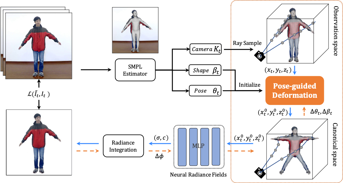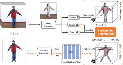 翻译:我们用单视录象来展示人造动的详细神经光亮场。我们的方法通过在学习场景展示网络的同时引入清晰的外形引导变形,将神经光亮场延伸到人类运动的动态场景。特别是,我们估计每个框架的人类面貌,并学习详细的人类样板的常态光亮空间,使人类从观察空间自然形状变形到由表面参数明确控制的金字塔空间。为了弥补不准确的外观估计,我们引入了在学习过程中更新最初面貌的外形改进战略,这不仅有助于学习更准确的人类重建,而且还加快了趋同速度。在实验中,我们证明拟议方法取得了以下成果:(1) 隐含的人类几何学和外观重建,具有高质量的细节,(2) 人类从新观点中呈现出真实的图像,以及(3) 人造新面的动画。