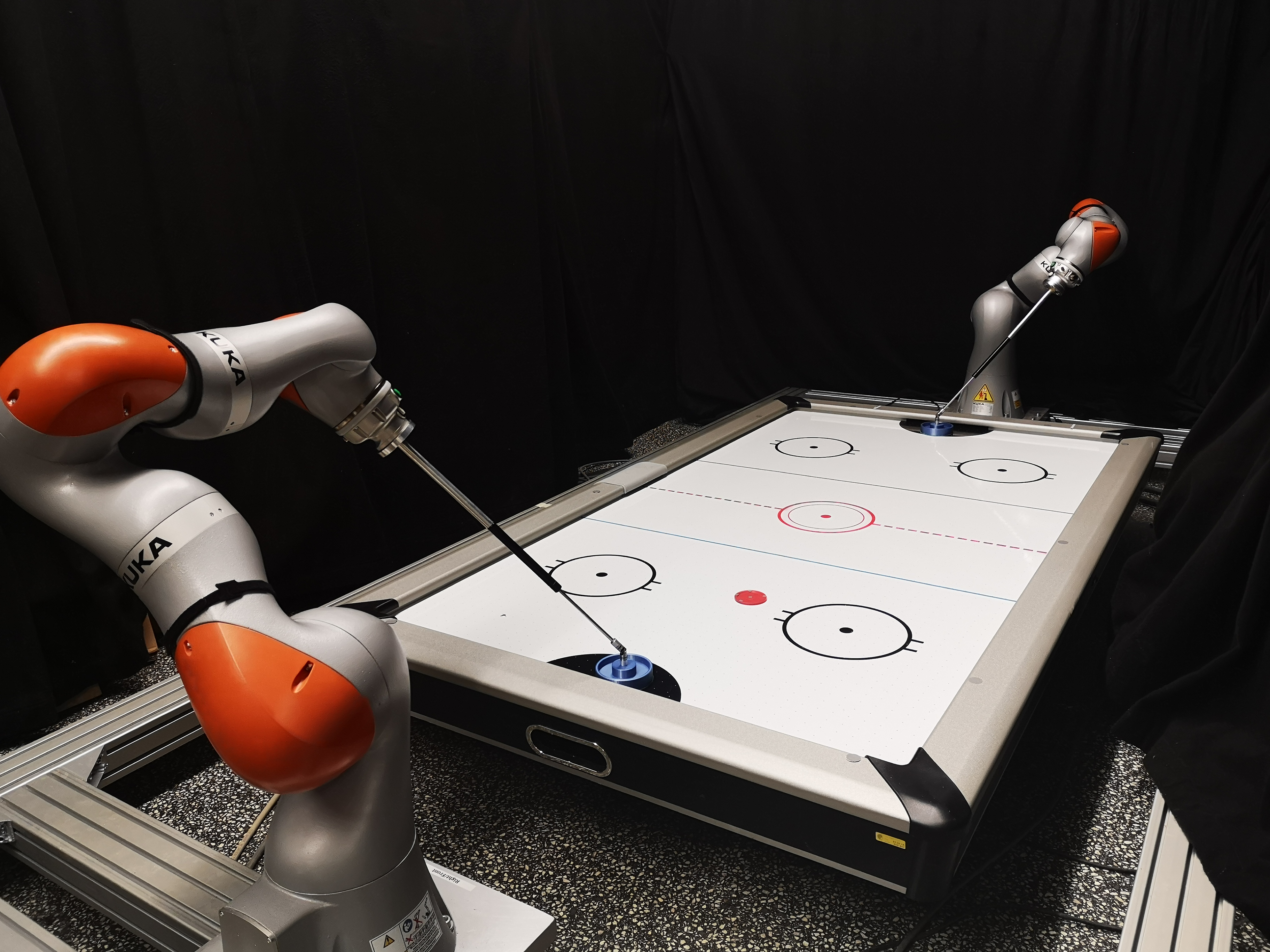 翻译:高度动态的机器人任务需要高速和被动的机器人。 由于物理限制、硬件限制以及动态和感官措施的高度不确定性,这些任务特别具有挑战性。 要面对这些问题,设计出能产生精确和快速轨迹并对环境变化立即作出反应的机器人剂至关重要。 空气曲棍球是这种任务的一个实例。 由于环境特性, 有可能将问题正规化并得出干净的数学解决方案。 基于这些原因, 这种环境对于推动限制现有通用机器人操纵器的性能是完美的。 我们用两个 Kuka Iiwa 14 来演示如何设计空曲棍球游戏通用机器人操纵器的政策。 我们证明真正的机器人臂可以进行快速打击运动, 两个机器人可以在模拟的中等空冰球桌上相互竞争。
