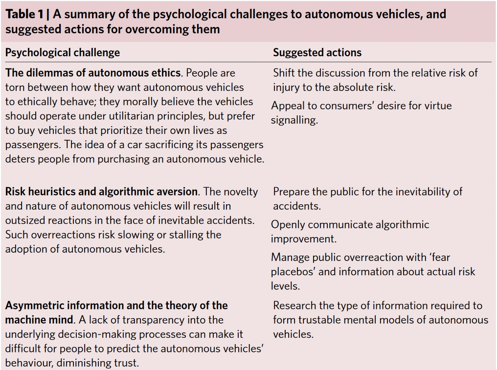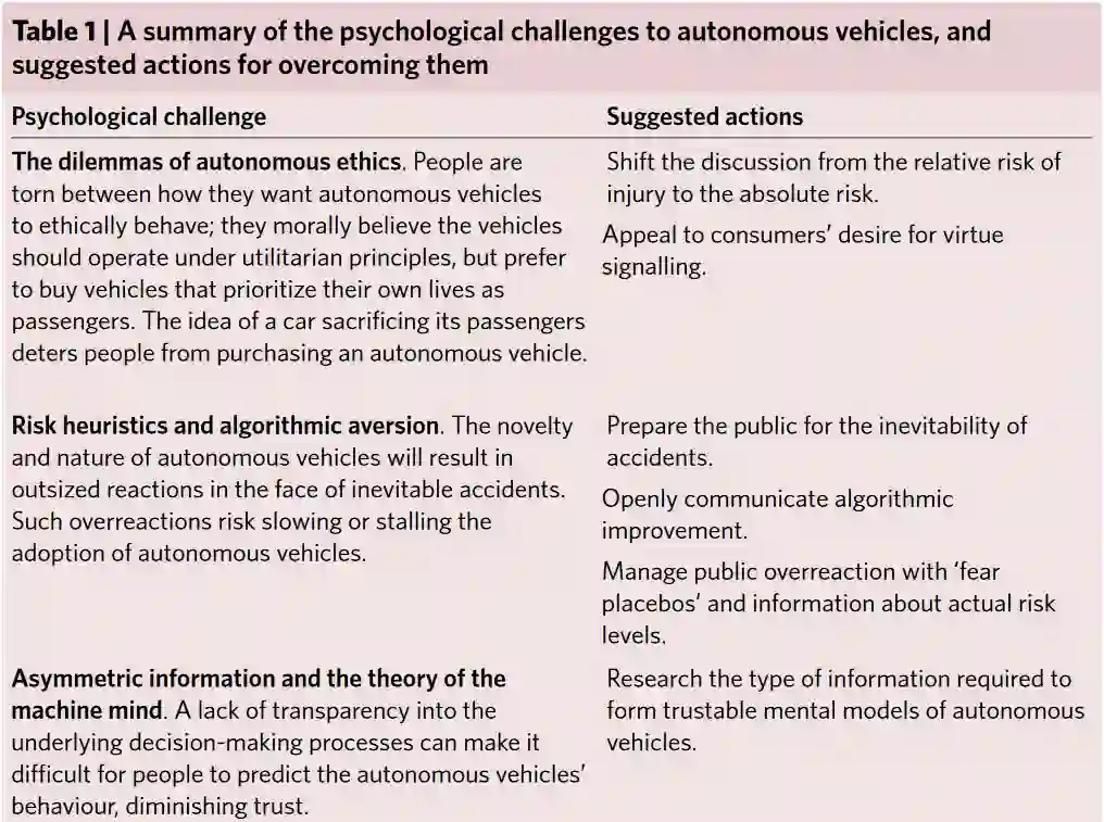 翻译:自驾汽车比我们习惯的人类驱动汽车提供了过多的安全优势,然而许多人却觉得与这些机器共享道路并把自己的生命托付给他们的驾驶能力令人不快。 因此,要广泛采用自治汽车,就需要通过仔细的规划和先入为主的思维来克服这些强制因素。 在这里,我们打破了三种主要的心理障碍,这些障碍可能阻碍甚至完全阻止它们被广泛采用,以及如何解决它们。