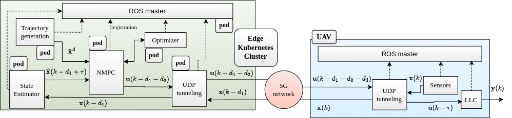 翻译:随着电磁计算等技术的出现,远程计算应用的地平线已经从多层面角度扩大了。自动无人驾驶航空飞行器(UAV)飞行任务是利用远程计算来催化其性能的重要应用。然而,将计算复杂性卸载到远程系统会增加该系统的潜伏。虽然5G网络网络等技术最大限度地减少通信延迟,但悬浮对无人驾驶飞行器控制的影响是不可避免的,并可能破坏系统的稳定。因此,必须考虑系统的延误,并在控制设计中补偿这些延误。因此,我们提议建立一个由5G网络、PACED-5G(使用Drones超过5G的电磁带预先自动控制)启用的基于Edge的新型预测控制结构。在拟议的控制结构中,我们设计了一个国家估计器,根据对时间变化延迟的现有知识来估计当前状态,设计了一个用于UAV跟踪参考轨迹的模型预测控制器(MPC),同时避免障碍,并提供界面,用于将高层任务卸载在UDAV系统上的两个测试案例。
