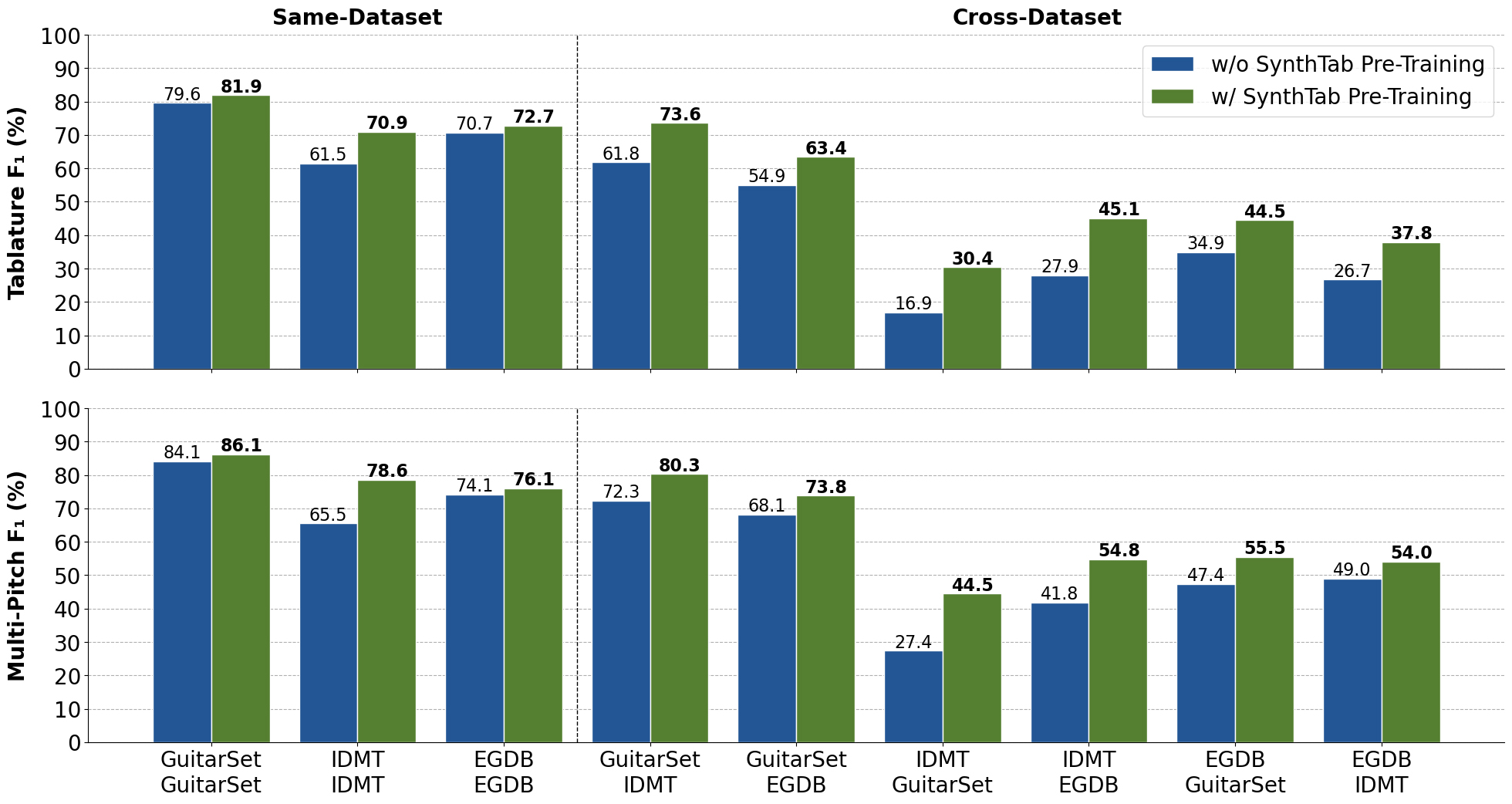 Guitar tablature is a form of music notation widely used among guitarists. It captures not only the musical content of a piece, but also its implementation and ornamentation on the instrument. Guitar Tablature Transcription (GTT) is an important task with broad applications in music education, composition, and entertainment. Existing GTT datasets are quite limited in size and scope, rendering models trained on them prone to overfitting and incapable of generalizing to out-of-domain data. In order to address this issue, we present a methodology for synthesizing large-scale GTT audio using commercial acoustic and electric guitar plugins. We procure SynthTab, a dataset derived from DadaGP, which is a vast and diverse collection of richly annotated symbolic tablature. The proposed synthesis pipeline produces audio which faithfully adheres to the original fingerings and a subset of techniques specified in the tablature, and covers multiple guitars and styles for each track. Experiments show that pre-training a baseline GTT model on SynthTab can improve transcription performance when fine-tuning and testing on an individual dataset. More importantly, cross-dataset experiments show that pre-training significantly mitigates issues with overfitting.