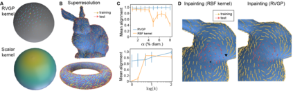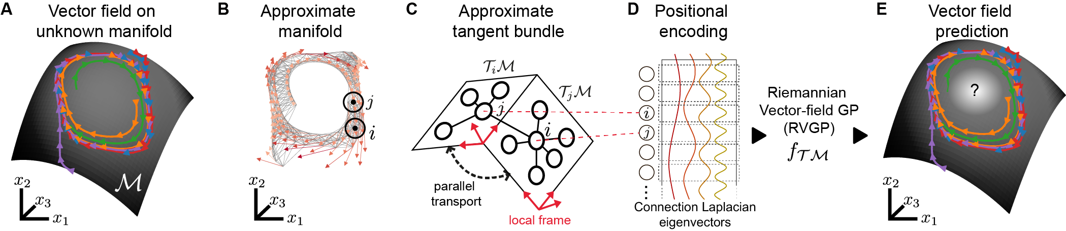 Gaussian processes (GPs) are popular nonparametric statistical models for learning unknown functions and quantifying the spatiotemporal uncertainty in data. Recent works have extended GPs to model scalar and vector quantities distributed over non-Euclidean domains, including smooth manifolds appearing in numerous fields such as computer vision, dynamical systems, and neuroscience. However, these approaches assume that the manifold underlying the data is known, limiting their practical utility. We introduce RVGP, a generalisation of GPs for learning vector signals over latent Riemannian manifolds. Our method uses positional encoding with eigenfunctions of the connection Laplacian, associated with the tangent bundle, readily derived from common graph-based approximation of data. We demonstrate that RVGP possesses global regularity over the manifold, which allows it to super-resolve and inpaint vector fields while preserving singularities. Furthermore, we use RVGP to reconstruct high-density neural dynamics derived from low-density EEG recordings in healthy individuals and Alzheimer's patients. We show that vector field singularities are important disease markers and that their reconstruction leads to a comparable classification accuracy of disease states to high-density recordings. Thus, our method overcomes a significant practical limitation in experimental and clinical applications.