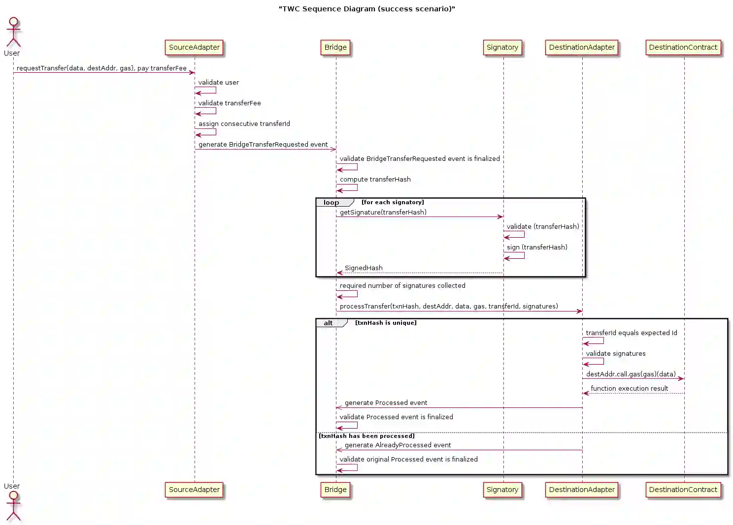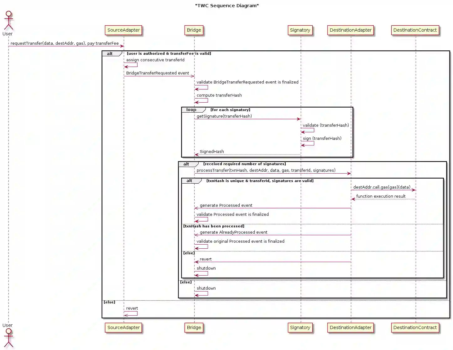 翻译:Transwarp-Conduit(Transwarp-Conduit)(TWC)是两个智能合同启用的块链之间的电文传输协议,此外,我们具体规定了一个应用框架(利用TWC协议),使开发商能够仅仅通过部署符合框架的智能合同和托管TPC节点(守护程序)来定义任意复杂的块链应用程序。