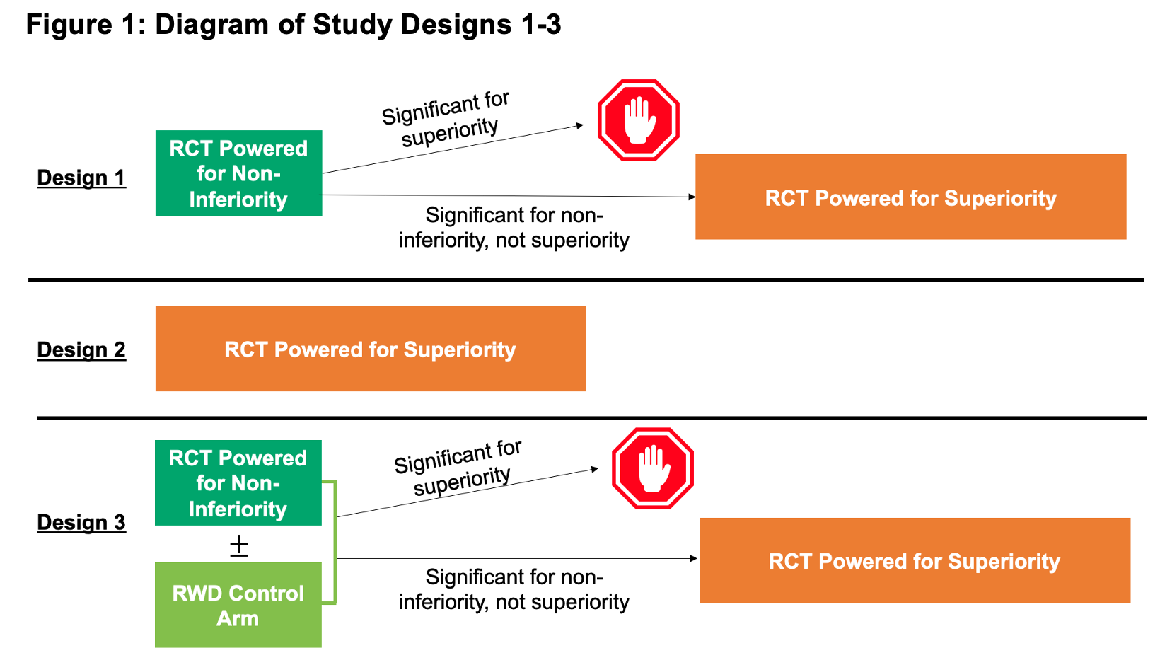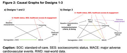 Introduction: Increasing interest in real-world evidence has fueled the development of study designs incorporating real-world data (RWD). Using the Causal Roadmap, we specify three designs to evaluate the difference in risk of major adverse cardiovascular events (MACE) with oral semaglutide versus standard-of-care: 1) the actual sequence of non-inferiority and superiority randomized controlled trials (RCTs), 2) a single RCT, and 3) a hybrid randomized-external data study. Methods: The hybrid design considers integration of the PIONEER 6 RCT with RWD controls using the experiment-selector cross-validated targeted maximum likelihood estimator. We evaluate 95% confidence interval coverage, power, and average patient-time during which participants would be precluded from receiving a glucagon-like peptide-1 receptor agonist (GLP1-RA) for each design using simulations. Finally, we estimate the effect of oral semaglutide on MACE for the hybrid PIONEER 6-RWD analysis. Results: In simulations, Designs 1 and 2 performed similarly. The tradeoff between decreased coverage and patient-time without the possibility of a GLP1-RA for Designs 1 and 3 depended on the simulated bias. In real data analysis using Design 3, external controls were integrated in 84% of cross-validation folds, resulting in an estimated risk difference of -1.53%-points (95% CI -2.75%-points to -0.30%-points). Conclusions: The Causal Roadmap helps investigators to minimize potential bias in studies using RWD and to quantify tradeoffs between study designs. The simulation results help to interpret the level of evidence provided by the real data analysis in support of the superiority of oral semaglutide versus standard-of-care for cardiovascular risk reduction.