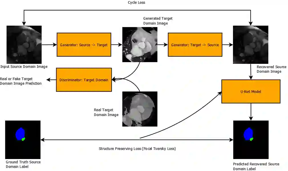 翻译:医学成像中的域偏移是一个普遍存在的问题,它会严重影响分割模型在处理未知图像域时的性能。如Cycle-GAN之类的对抗性深度学习模型已成为处理医学图像无监督域适应的常用模型。然而,这些模型在转换医学扫描时没有保留感兴趣的结构的能力,这可能导致分割上下文中未监督域适应的潜在差结果。本文介绍了结构保持的Cycle-GAN (SP Cycle-GAN),它通过在整个Cycle-GAN训练过程中实施分割损失项来促进医学结构的保持。我们通过可视化和与无监督域适应模型的Dice分数分割性能比较,证明了SP Cycle-GAN的结构保持能力。 SP Cycle-GAN能够在STARE和DRIVE数据集的二元血管分割和多模式MM-WHS数据集的多类左心室和心肌分割方面优于基准方法和标准Cycle-GAN域适应。在MR到CT MM-WHS域适应问题上,SP Cycle-GAN实现了最先进的心肌分割Dice分数(DSC)为0.7435,并在MM-WHS数据集的几乎所有类别中表现出色。 SP Cycle-GAN还展示了在DRIVE到STARE域适应问题中保持血管结构的强大能力,比默认的Cycle-GAN实现增加了4% DSC。