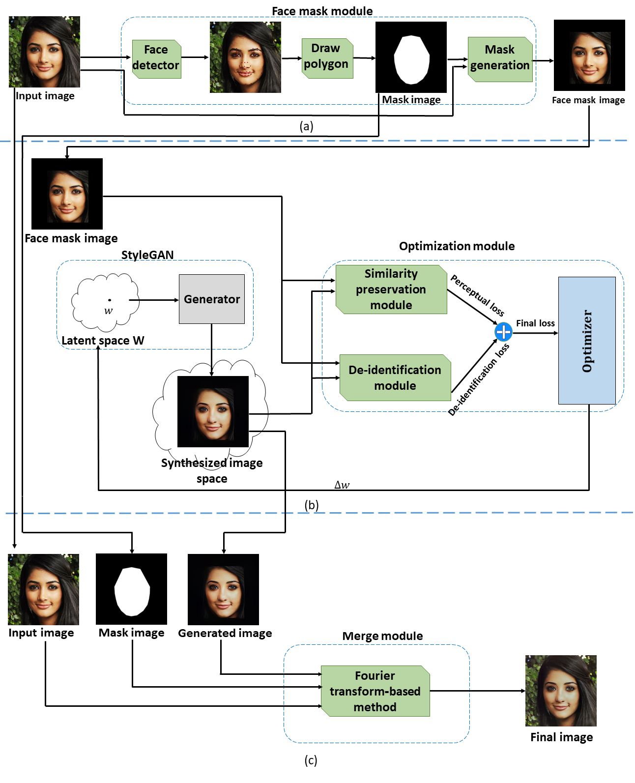 翻译:社交媒体网站和应用程序的使用变得非常受欢迎,人们在这些网络上分享他们的照片。在这些网络上对人们照片的自动识别和标记带来了隐私保护问题,用户寻求从这些算法中隐藏其身份的方法。创用对抗性网络(GANs)显示在以高度多样性制作脸部图像和编辑面部图像方面非常强大。在本文中,我们提议以GANs为基础的“General Mask-Guided Face 图像管理”模型(GMFIM)模型,在输入面部图像上应用不易察觉的编辑,以维护图像中个人的隐私。我们的模型由三个主要部分组成:a)将面部图像区域从输入图像中切除并省略背景的方法;b)基于GAN的优化模块在管理面部图像和隐藏面部图像时表现非常有力;c)将输入图像的背景和被操纵的面部图像合并在一起的模块。在优化的模型损失功能中考虑不同的标准,以产生与输入图像的高质量图像尽可能相似的图像。在AFR质量系统中无法更多地识别,同时从AFRest质量系统获得更高的数据测试结果。