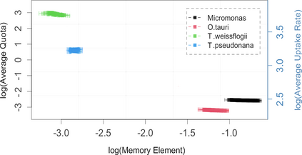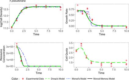翻译:Monod 模型描述微生物利用细胞外资源浓度的超偏移功能而生长的微生物。 在这种模型与实验数据相比变化不定或有限的资源浓度下,该模型运行不良,它激励着更复杂的Droop模型,并有一个时间变化的内部储存库。我们扩展了单项模型,以包含过去条件的记忆,增加了一个由分微微积分分析驱动的单一参数。我们展示了如何在生物背景下解释记忆元素,并描述其与资源储存库的联系。在非平衡条件下氮饥饿的情况下,我们用模拟和实验性数据来验证该模型,从对地原子(T.伪诺纳和T. Weisflogii)和prasinophytes(Micromonas sp. and O. tauri)的实验室文化中获取的经验数据。我们利用统计分析,显示我们的单项模型估计了生长速率、细胞密度和资源浓度以及Droop 模型,同时要求一个较低的状态变量。我们简单的模型可以改进在低计算成本的复杂地球系统模型中对植物浮游生物动态的描述。