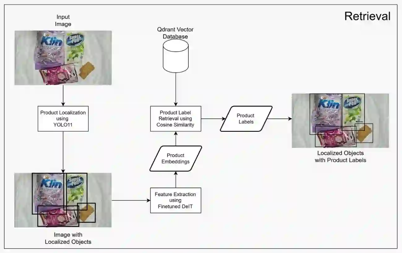 翻译:目标检测是计算机视觉领域的一项核心任务,被广泛应用于众多领域。然而,目标检测模型仍然面临灾难性遗忘问题。每当引入新产品时,模型不仅需要使用新产品的数据集,还必须结合全部历史数据集进行重新训练。其结果显而易见:模型训练成本不断攀升,且耗时显著。在零售收银等诸多行业中,新产品的频繁引入构成了巨大挑战。本研究提出了基于零再训练的目标识别与检测方法(ZeBROD),该方法旨在通过整合YOLO11n进行目标定位,以及结合DeIT和代理锚点损失进行特征提取与度量学习,以解决灾难性遗忘问题。在分类阶段,我们利用目标产品的嵌入特征与Qdrant向量数据库中特征之间的余弦相似度进行计算。在一项涵盖140种产品的零售商店案例研究中,实验结果表明,无论是对新产品还是现有产品进行检测,我们所提出的框架均取得了令人鼓舞的准确率。此外,由于无需重新训练,训练时长差异显著。与经典目标检测方法相比,我们的训练时间效率提升了近3倍。随着更多新产品被添加到产品数据库中,这一效率优势将进一步扩大。在边缘设备上,每张包含多个产品的图像平均推理时间为580毫秒,验证了所提框架在实际应用中的可行性。