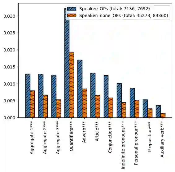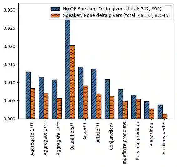 翻译:语言便利是发言者根据彼此的交流风格调整其口音、字典、词汇和语言其他方面的过程; 以前的研究表明语言便利与发言者力量和地位的差距及其促进认可和讨论效率的方式之间的关系; 在这项工作中,我们从新的角度看待这种现象,探讨它与发言者的开放态度而不是与其社会地位之间的关系; 我们处理在Reddit's Change My View(CMV) subreddit(CMV) subdit中进行的数千次非结构化的争论,表明开放态度与发言者在不同情况下所扮演的角色有关; 在讨论层面,我们惊讶地发现,达成协议的讨论的便利程度较低。