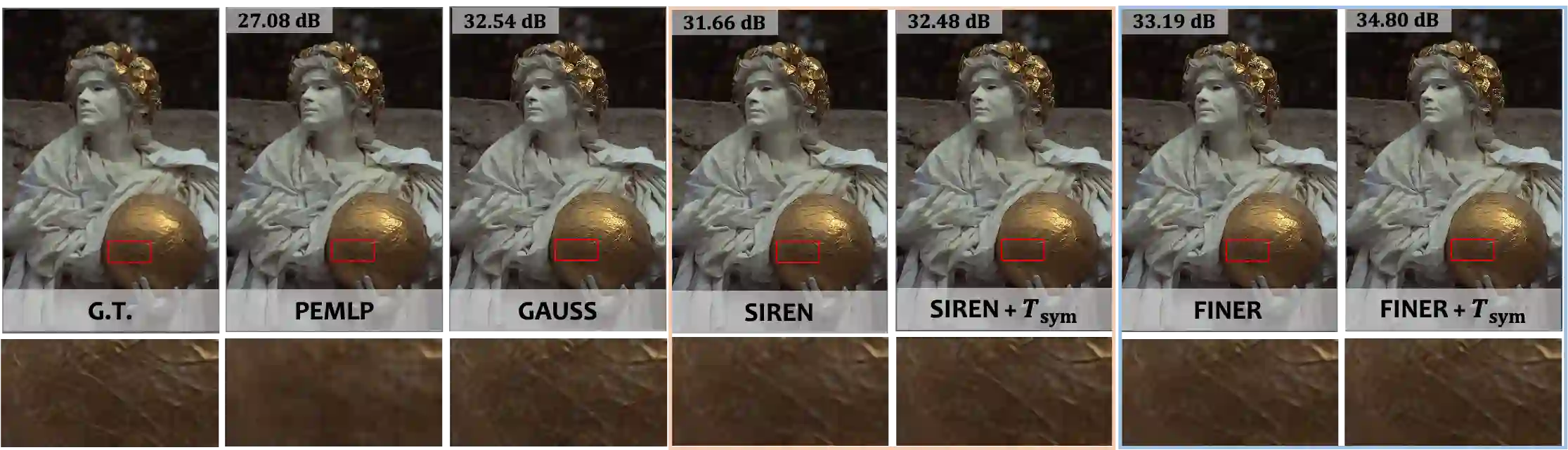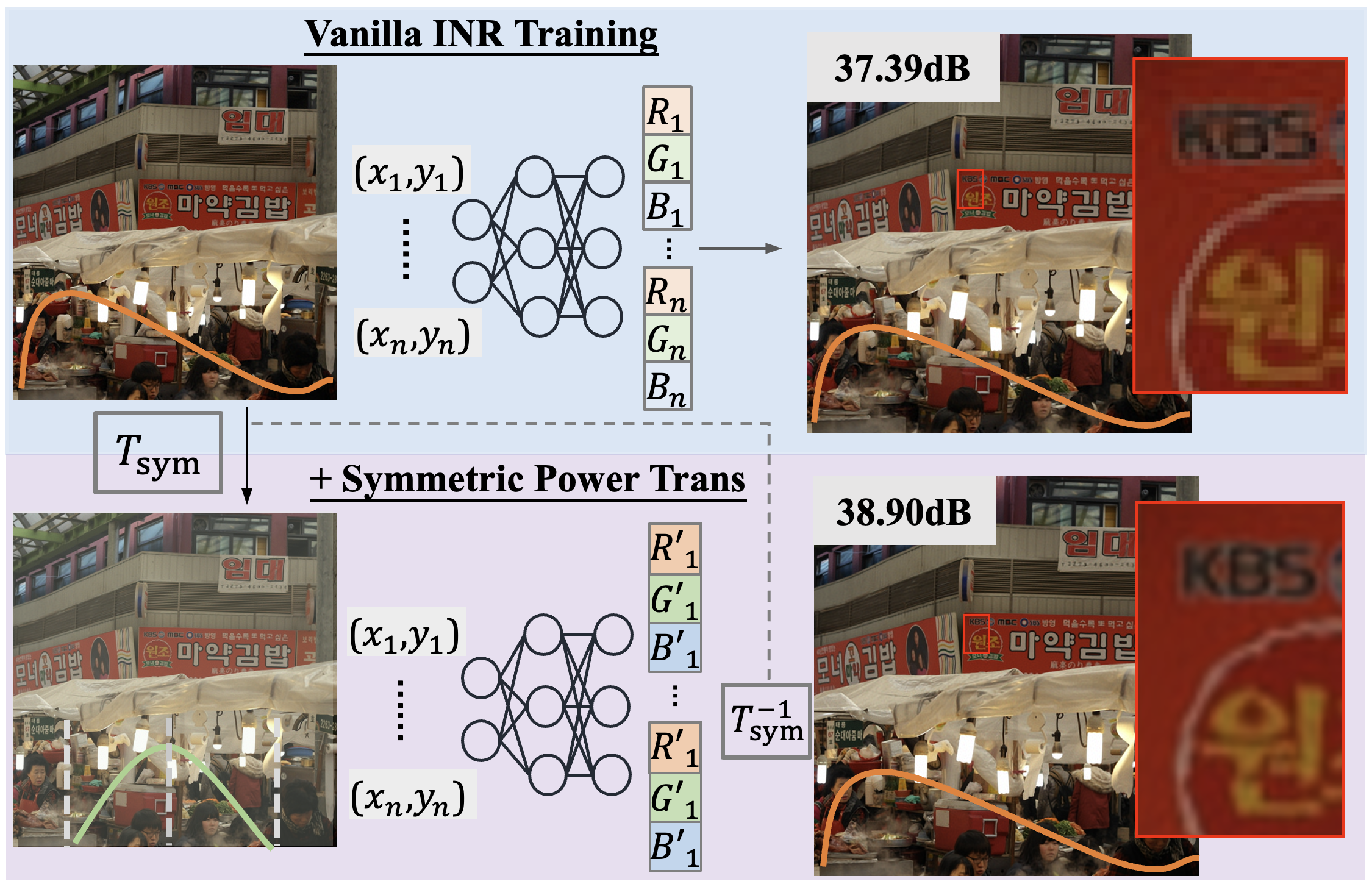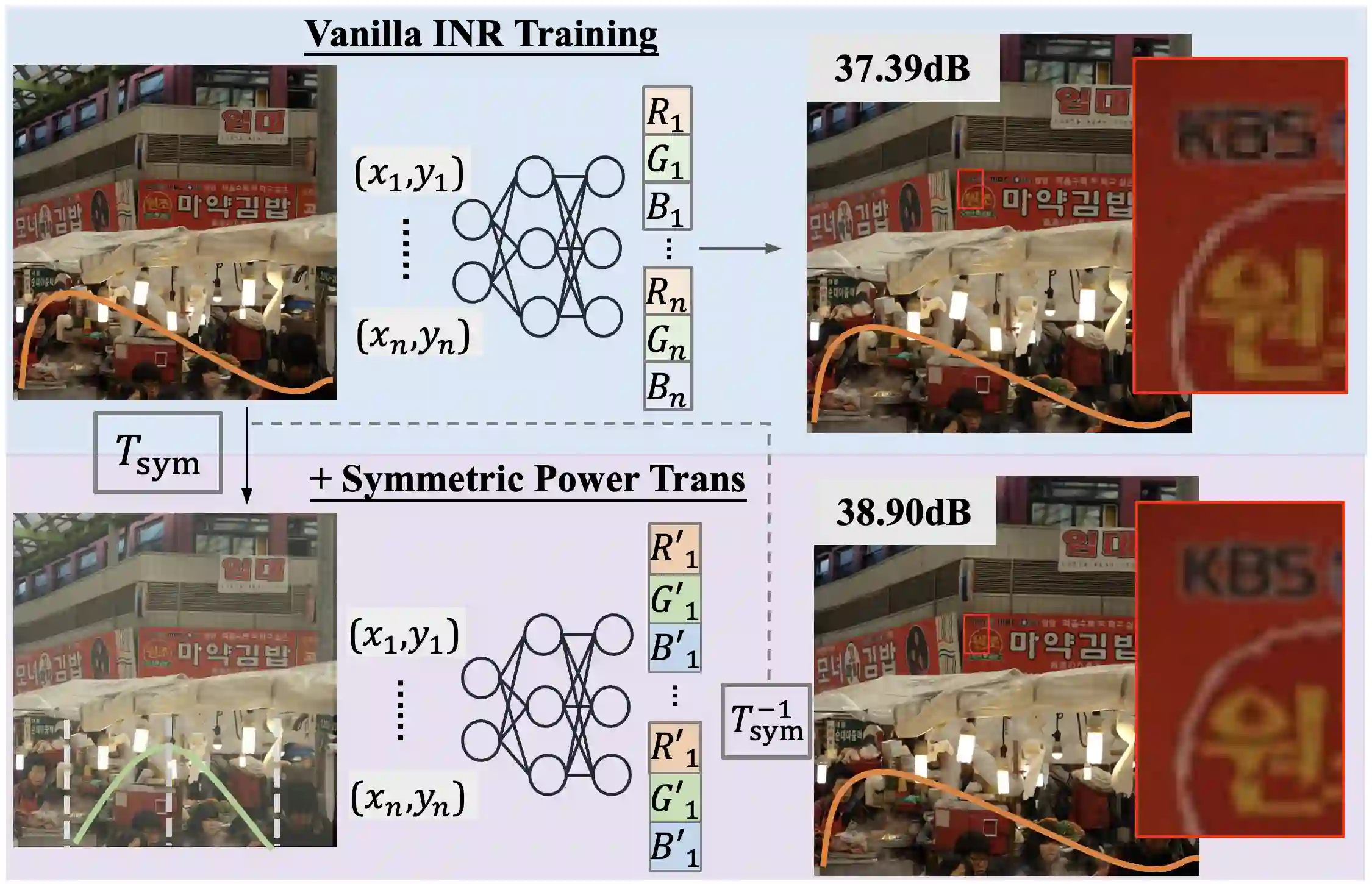 We propose symmetric power transformation to enhance the capacity of Implicit Neural Representation~(INR) from the perspective of data transformation. Unlike prior work utilizing random permutation or index rearrangement, our method features a reversible operation that does not require additional storage consumption. Specifically, we first investigate the characteristics of data that can benefit the training of INR, proposing the Range-Defined Symmetric Hypothesis, which posits that specific range and symmetry can improve the expressive ability of INR. Based on this hypothesis, we propose a nonlinear symmetric power transformation to achieve both range-defined and symmetric properties simultaneously. We use the power coefficient to redistribute data to approximate symmetry within the target range. To improve the robustness of the transformation, we further design deviation-aware calibration and adaptive soft boundary to address issues of extreme deviation boosting and continuity breaking. Extensive experiments are conducted to verify the performance of the proposed method, demonstrating that our transformation can reliably improve INR compared with other data transformations. We also conduct 1D audio, 2D image and 3D video fitting tasks to demonstrate the effectiveness and applicability of our method.