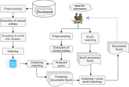 In this paper, we propose an alternative to deep neural networks for semantic information retrieval for the case of long documents. This new approach exploiting clustering techniques to take into account the meaning of words in Information Retrieval systems targeting long as well as short documents. This approach uses a specially designed clustering algorithm to group words with similar meanings into clusters. The dual representation (lexical and semantic) of documents and queries is based on the vector space model proposed by Gerard Salton in the vector space constituted by the formed clusters. The originalities of our proposal are at several levels: first, we propose an efficient algorithm for the construction of clusters of semantically close words using word embedding as input, then we define a formula for weighting these clusters, and then we propose a function allowing to combine efficiently the meanings of words with a lexical model widely used in Information Retrieval. The evaluation of our proposal in three contexts with two different datasets SQuAD and TREC-CAR has shown that is significantly improves the classical approaches only based on the keywords without degrading the lexical aspect.