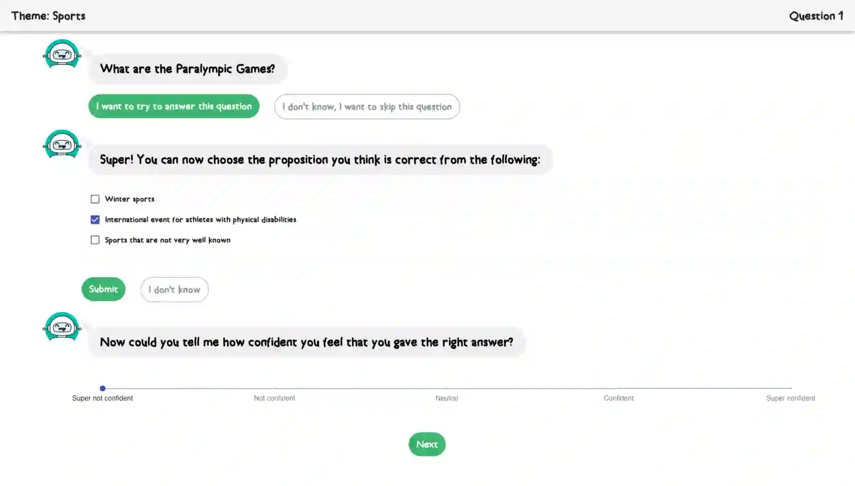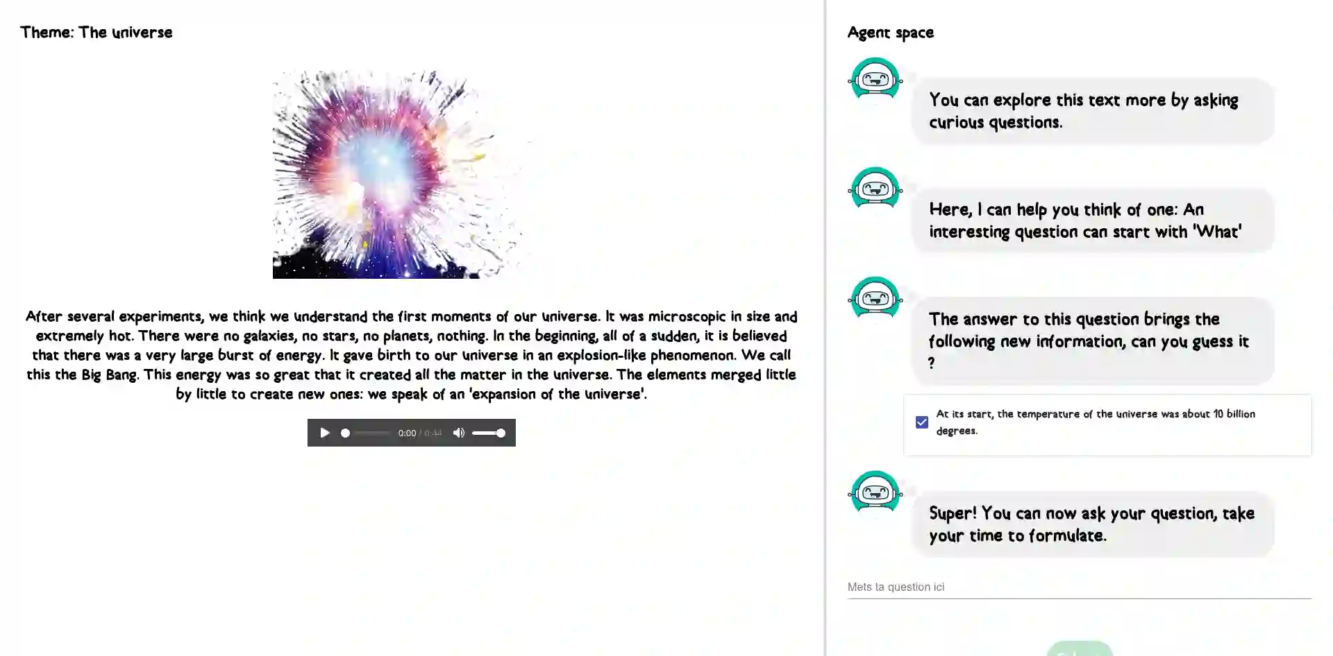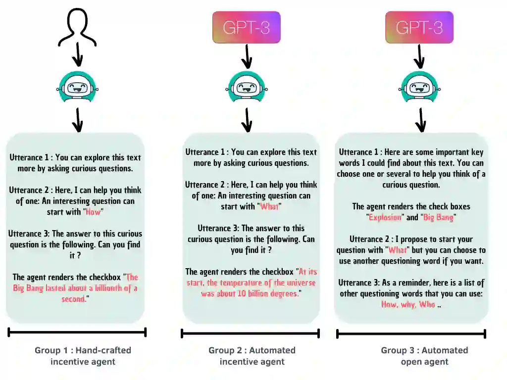 翻译:学生询问好奇问题的能力是提高学习过程的关键技能。 为了培训这一技能, 先前的研究使用了一个对话工具, 提出具体的提示, 以激发儿童学习过程中的好奇心。 尽管显示教学效率, 这种方法仍然有限, 因为它依赖于每个教育资源亲手生成所述提示, 这可能是一个非常漫长和昂贵的过程。 在这方面, 我们利用自然语言处理领域的进步, 并探索使用一个大型语言模型( GPT-3) 来自动生成该代理的好奇心促进提示, 以帮助儿童问更多更深的问题。 我们随后利用这项研究来调查该代理的不同好奇心促进行为。 这项研究是针对75个年龄在9至10岁之间的学生进行的, 他们要么与一个手写手写的对话工具互动, 提出“ 关闭” 手动的提示, 导致预先界定问题。 一个由GPT-3驱动的大型语言模型( GPT 3 ) 提出同样的提示, 或者由GPT-3 驱动的“ 开启” 提示, 可以导致几个可能的问题。 结果显示一个类似的问题在儿童中间的“ 学习 G- PT 的结果 ” 。