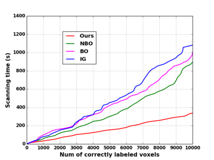 翻译:我们建议一种新颖的方法,在网上 RGBD 重建 RGBD 以语义分隔法为基础,积极理解未知室内场景。 在我们的方法中,探索性机器人扫描由来自现场的语义物体的识别和分化驱动,并以这些物体的分数为目标。我们的算法建在体积深度聚合框架(如KinectFusion)的顶部,对在线重建的体积进行基于oxel 的实时文体标贴。机器人以在线估计离散查看分评分场参数为指导,在2D 位置和方位旋转的 3D 空间上设定参数。每个网格的 VSF 储存相应视图的分数,用来衡量它如何减少几何重整和语义标记的不确定性( entropyy) 。 我们根据VSF, 选择下一个最佳视图( NBVV) 作为每个时间步骤的目标。 然后我们共同优化两个相邻的 NBVV 之间的轨迹和摄像轨迹轨迹, 通过尽可能扩大统一浏览分数( 信息获得) 和扫描轨道。通过广泛的评估,我们的方法在网上的轨道上找到。