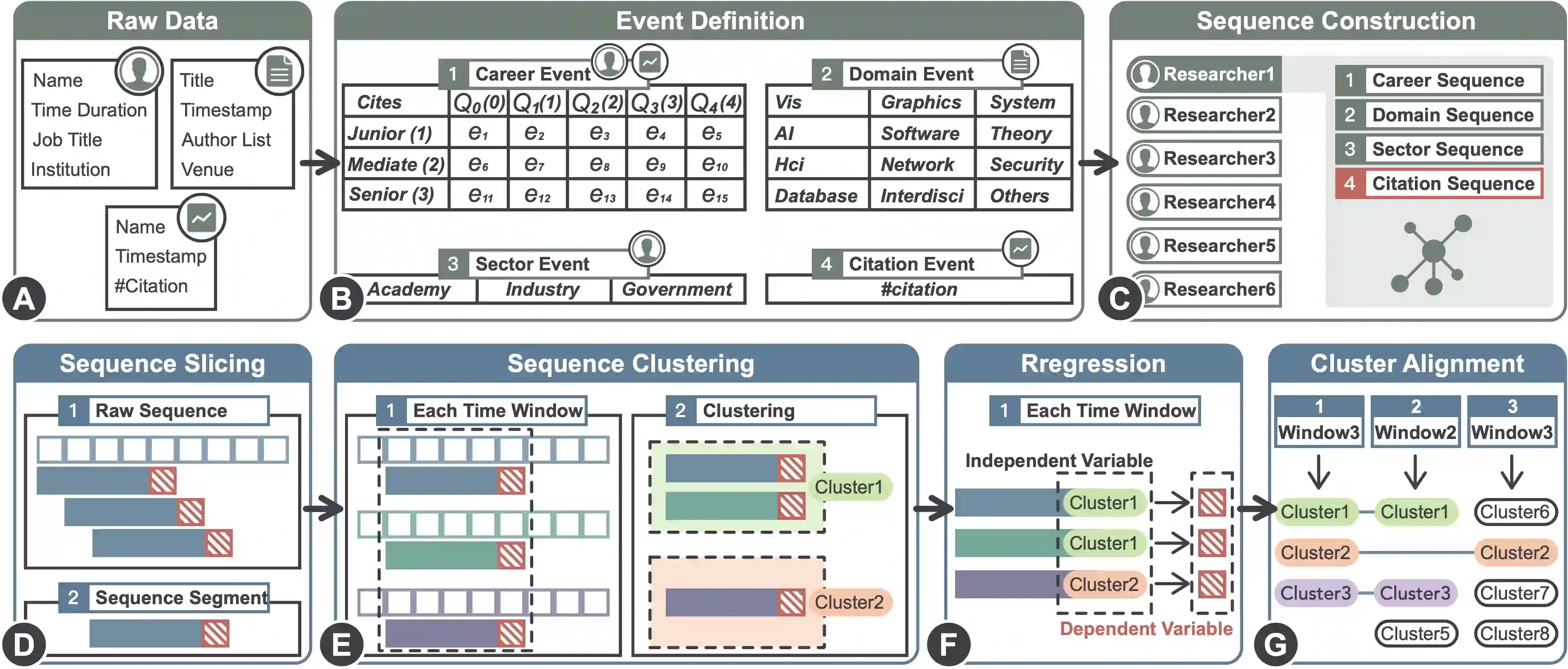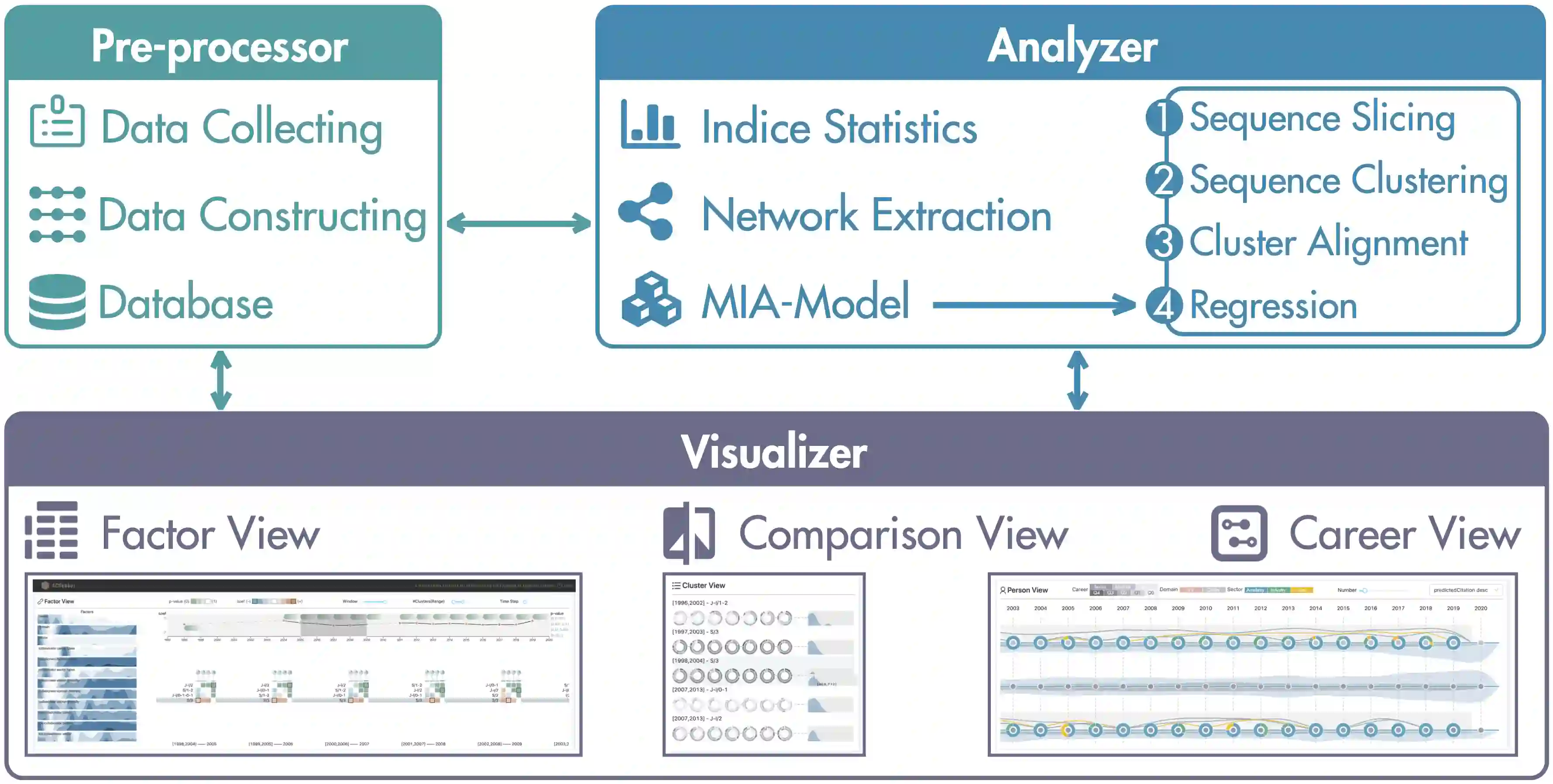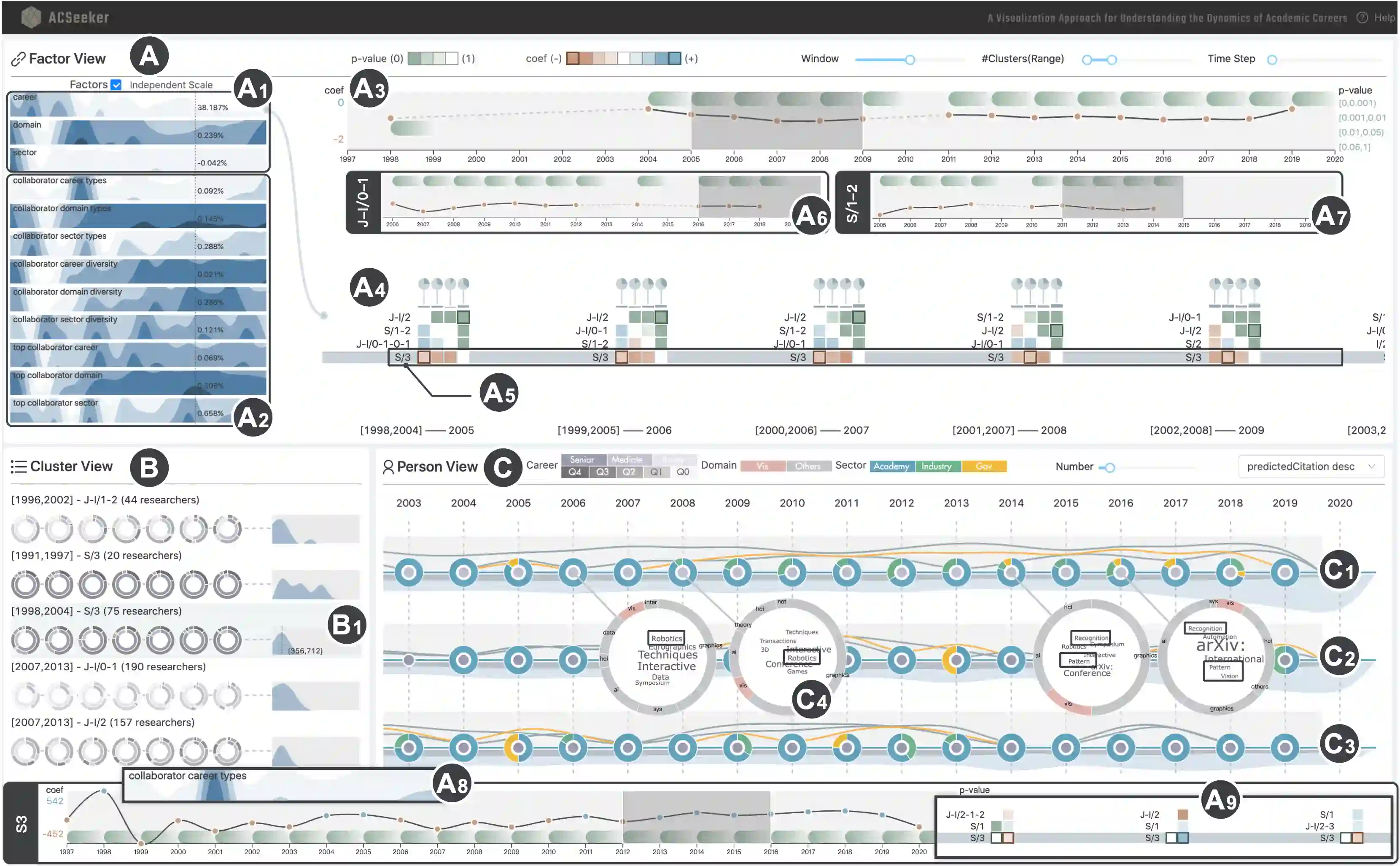 翻译:如何实现学术职业成功是社会科学研究中长期存在的一个研究问题。随着大量有详细记录的学术简介和职业轨迹的日益普及,学术上对职业成功的兴趣得到了重新激发,这已成为一个名为科学科学(即科学科学)的积极研究领域。在本研究报告中,我们采用了创新的动态视角,以研究个人和社会因素如何影响长期职业成功。我们提议采用互动的视觉分析方法ACSeearker,以探讨成功的潜在因素以及多种因素变化对不同学术职业阶段的影响。我们首先采用了多因素影响分析框架来估计不同因素对学术职业成功的影响,然后我们开发了一个视觉分析系统,以交互理解动态影响。设计了一个新的时间表,以揭示和比较基于整个人口的因素影响。我们提供了一个显示个人职业发展的定制职业路线,以便进行详细检查。为了验证ACSeeerker的实效和实用性,我们报告与社会科学家和一般研究人员进行的两个案例研究和访谈。