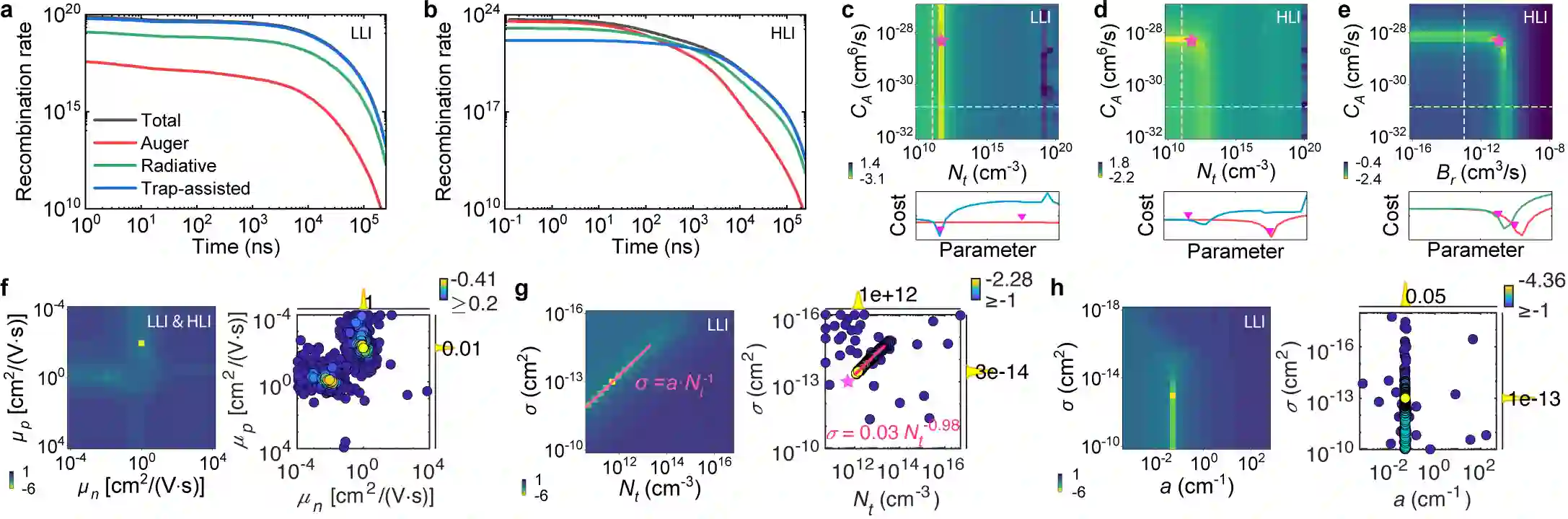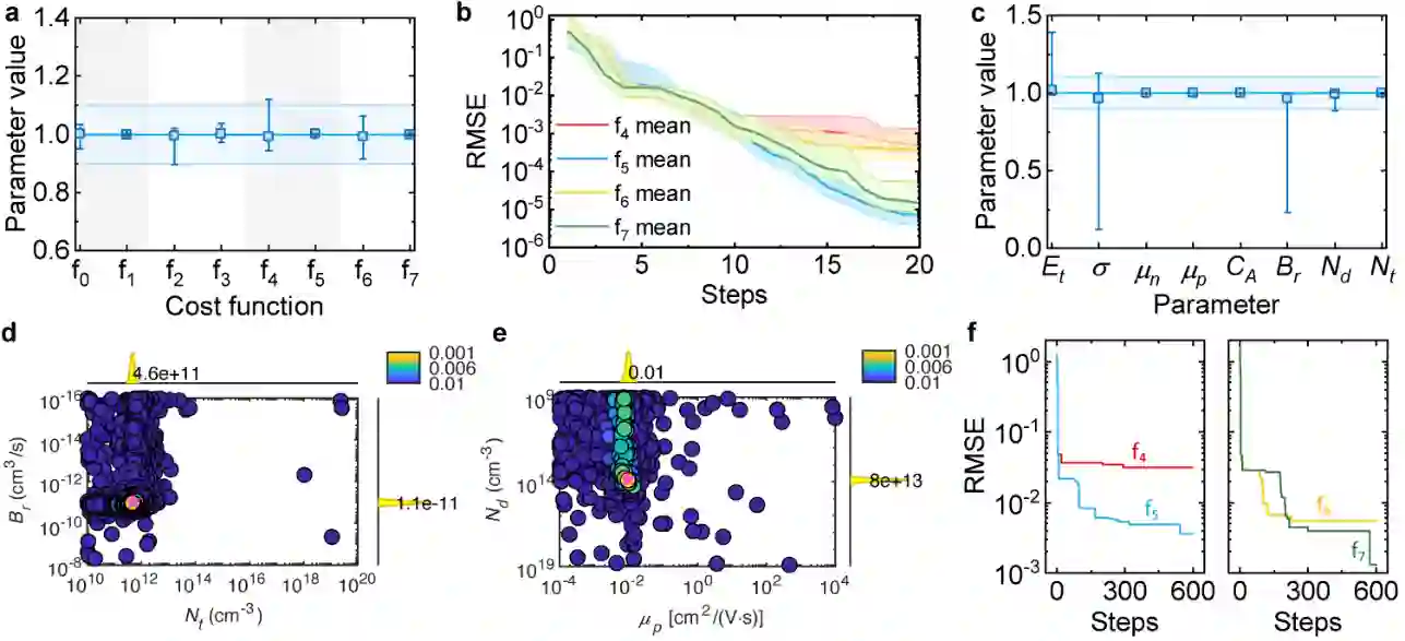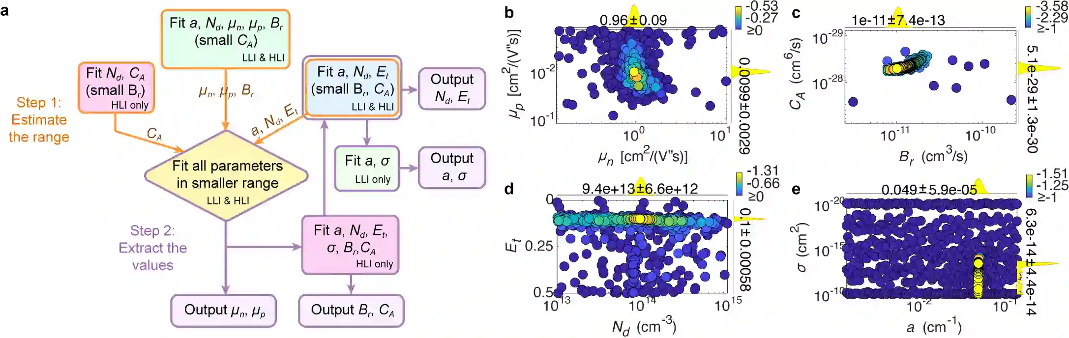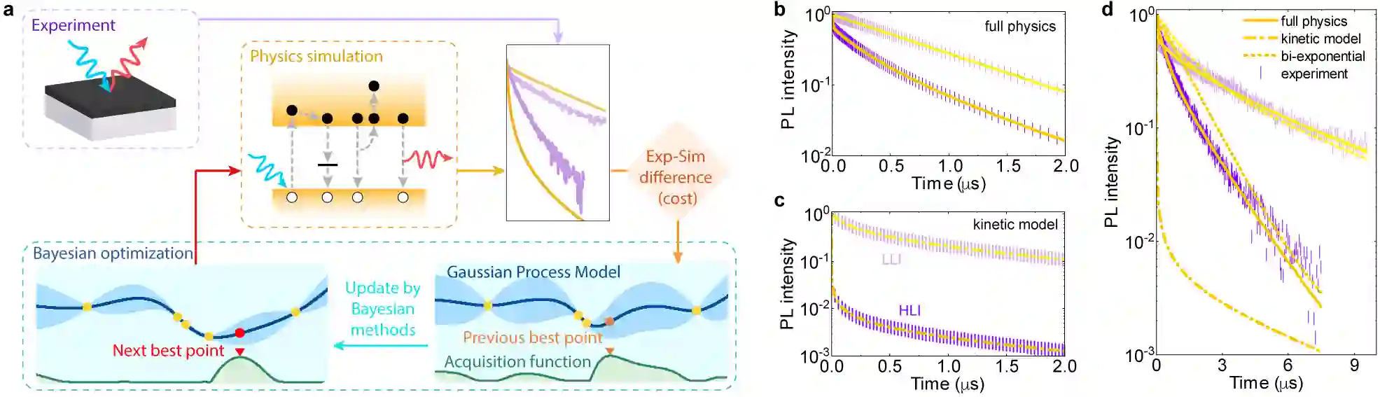 The ability to extract material parameters of perovskite from quantitative experimental analysis is essential for rational design of photovoltaic and optoelectronic applications. However, the difficulty of this analysis increases significantly with the complexity of the theoretical model and the number of material parameters for perovskite. Here we use Bayesian optimization to develop an analysis platform that can extract up to 8 fundamental material parameters of an organometallic perovskite semiconductor from a transient photoluminescence experiment, based on a complex full physics model that includes drift-diffusion of carriers and dynamic defect occupation. An example study of thermal degradation reveals that changes in doping concentration and carrier mobility dominate, while the defect energy level remains nearly unchanged. This platform can be conveniently applied to other experiments or to combinations of experiments, accelerating materials discovery and optimization of semiconductor materials for photovoltaics and other applications.