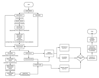 In the following paper, we have combined the various basic functionalities provided by the NumPy library and OpenCv library, which is an open source for Computer Vision applications, like conversion of colored images to grayscale, calculating threshold, finding contours and using those contour points to take perspective transform of the image inputted by the user, using Python version 3.7. Additional features include cropping, rotating and saving as well. All these functions and features, when implemented step by step, results in a complete scanning application. The applied procedure involves the following steps: Finding contours, applying Perspective transform and brightening the image, Adaptive Thresholding and applying filters for noise cancellation, and Rotation features and perspective transform for a special cropping algorithm. The described technique is implemented on various samples.
