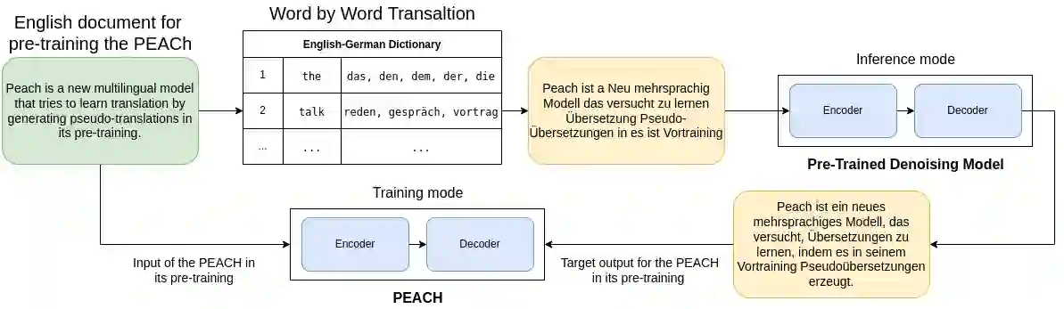 Multilingual pre-training significantly improves many multilingual NLP tasks, including machine translation. Most existing methods are based on some variants of masked language modeling and text-denoising objectives on monolingual data. Multilingual pre-training on monolingual data ignores the availability of parallel data in many language pairs. Also, some other works integrate the available human-generated parallel translation data in their pre-training. This kind of parallel data is definitely helpful, but it is limited even in high-resource language pairs. This paper introduces a novel semi-supervised method, SPDG, that generates high-quality pseudo-parallel data for multilingual pre-training. First, a denoising model is pre-trained on monolingual data to reorder, add, remove, and substitute words, enhancing the pre-training documents' quality. Then, we generate different pseudo-translations for each pre-training document using dictionaries for word-by-word translation and applying the pre-trained denoising model. The resulting pseudo-parallel data is then used to pre-train our multilingual sequence-to-sequence model, PEACH. Our experiments show that PEACH outperforms existing approaches used in training mT5 and mBART on various translation tasks, including supervised, zero- and few-shot scenarios. Moreover, PEACH's ability to transfer knowledge between similar languages makes it particularly useful for low-resource languages. Our results demonstrate that with high-quality dictionaries for generating accurate pseudo-parallel, PEACH can be valuable for low-resource languages.