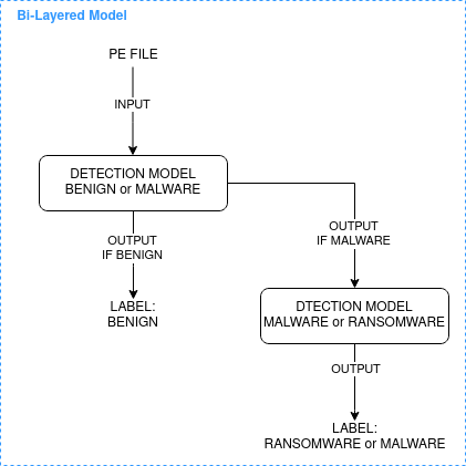 Cybercrime is one of the major digital threats of this century. In particular, ransomware attacks have significantly increased, resulting in global damage costs of tens of billion dollars. In this paper, we train and test different Machine Learning and Deep Learning models for malware detection, malware classification and ransomware detection. We introduce a novel and flexible ransomware detection model that combines two optimized models. Our detection results on a limited dataset demonstrate good accuracy and F1 scores.