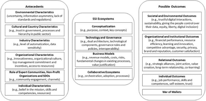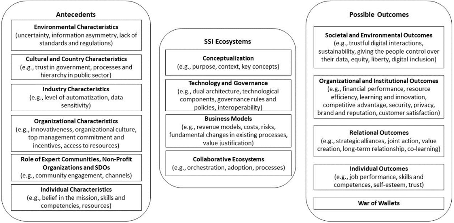 In the current global situation-burdened by, among others, a vast number of people without formal identification, digital leap, the need for health passports and contact tracking applications-providing private and secure digital identity for individuals, organizations and other entities is crucial. The emerging self-sovereign identity (SSI) solutions rely on distributed ledger technologies and verifiable credentials and have the potential to enable trustful digital interactions. In this human-centric paradigm, trust among actors can be established in a decentralized manner while the identity holders are able to own and control their confidential data. In this paper, we build on observations gathered in a field study to identify the building blocks, antecedents and possible outcomes of SSI ecosystems. We also showcase opportunities for researchers and practitioners to investigate this phenomenon from a wide range of domains and theories, such as the digital innovation ecosystems, value co-creation, surveillance theory, or entrepreneurship theories.