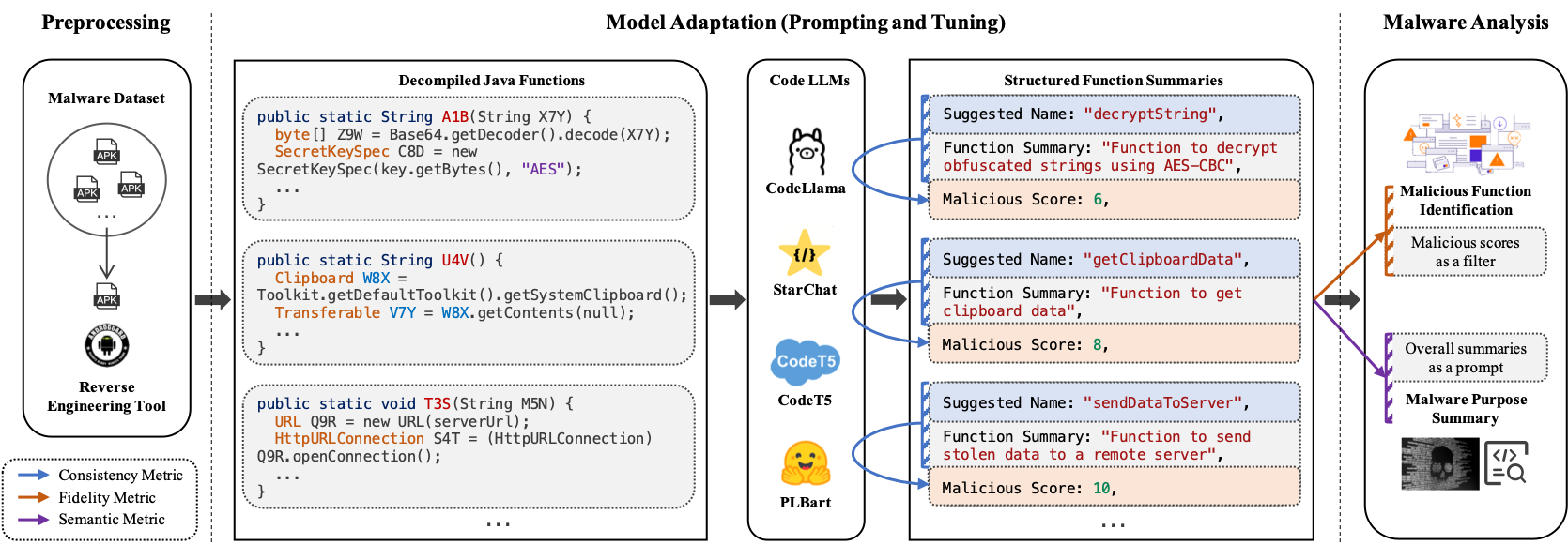 Large Language Models (LLMs) have demonstrated strong capabilities in various code intelligence tasks. However, their effectiveness for Android malware analysis remains underexplored. Decompiled Android code poses unique challenges for analysis, primarily due to its large volume of functions and the frequent absence of meaningful function names. This paper presents Cama, a benchmarking framework designed to systematically evaluate the effectiveness of Code LLMs in Android malware analysis tasks. Cama specifies structured model outputs (comprising function summaries, refined function names, and maliciousness scores) to support key malware analysis tasks, including malicious function identification and malware purpose summarization. Built on these, it integrates three domain-specific evaluation metrics, consistency, fidelity, and semantic relevance, enabling rigorous stability and effectiveness assessment and cross-model comparison. We construct a benchmark dataset consisting of 118 Android malware samples, encompassing over 7.5 million distinct functions, and use Cama to evaluate four popular open-source models. Our experiments provide insights into how Code LLMs interpret decompiled code and quantify the sensitivity to function renaming, highlighting both the potential and current limitations of Code LLMs in malware analysis tasks.