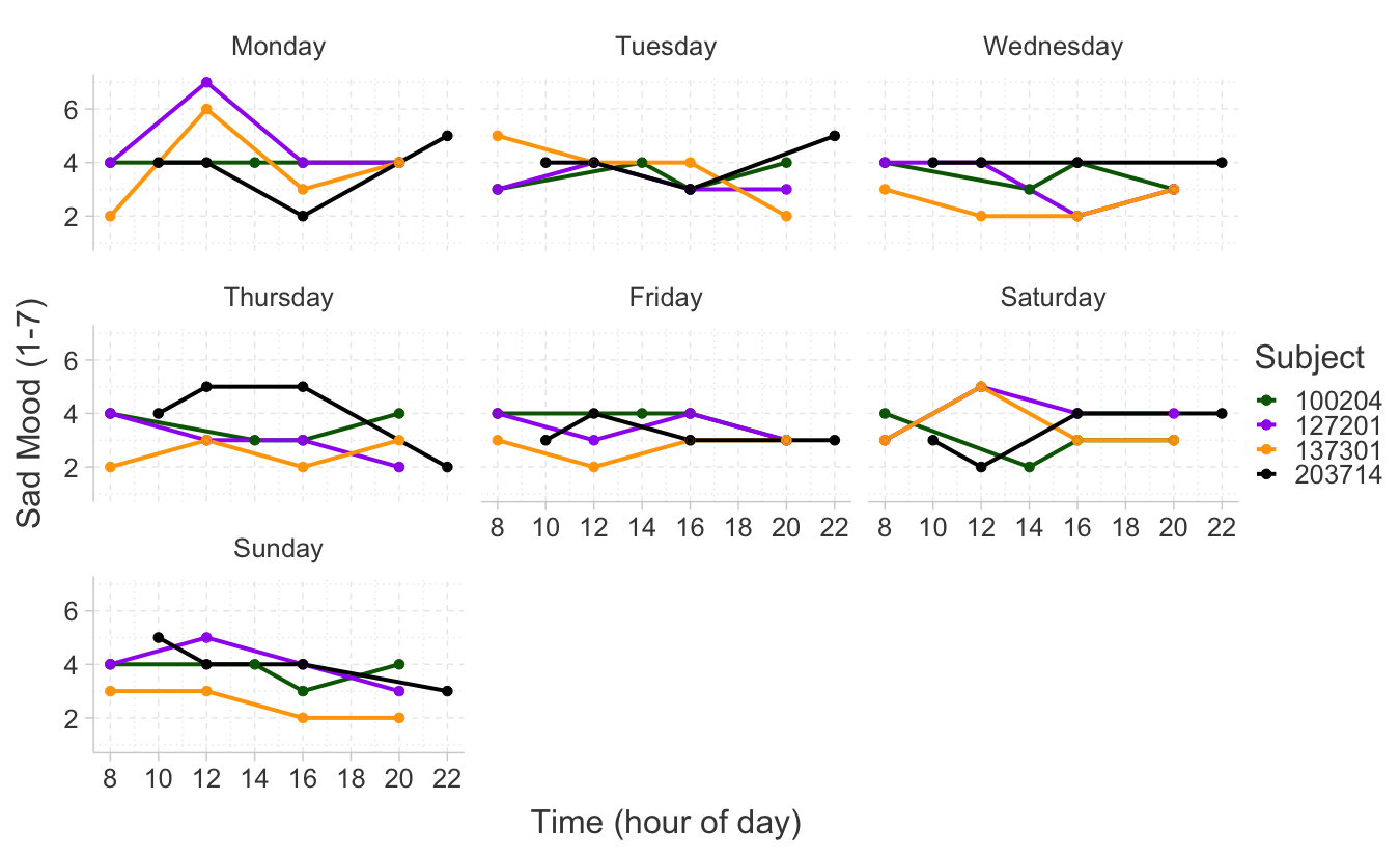 Mobile health studies often collect multiple within-day self-reported assessments of participants' behavior and well-being on different scales such as physical activity (continuous), pain levels (truncated), mood states (ordinal), and life events (binary). These assessments, when indexed by time of day, can be treated as functional data of different types - continuous, truncated, ordinal, and binary. We develop a functional principal component analysis that deals with all four types of functional data in a unified manner. It employs a semiparametric Gaussian copula model, assuming a generalized latent non-paranormal process as the underlying mechanism for these four types of functional data. We specify latent temporal dependence using a covariance estimated through Kendall's tau bridging method, incorporating smoothness during the bridging process. Simulation studies demonstrate the method's competitive performance under both dense and sparse sampling conditions. We then apply this approach to data from 497 participants in the National Institute of Mental Health Family Study of the Mood Disorder Spectrum to characterize within-day temporal patterns of mood differences among individuals with major mood disorder subtypes, including Major Depressive Disorder, Type 1, and Type 2 Bipolar Disorder.