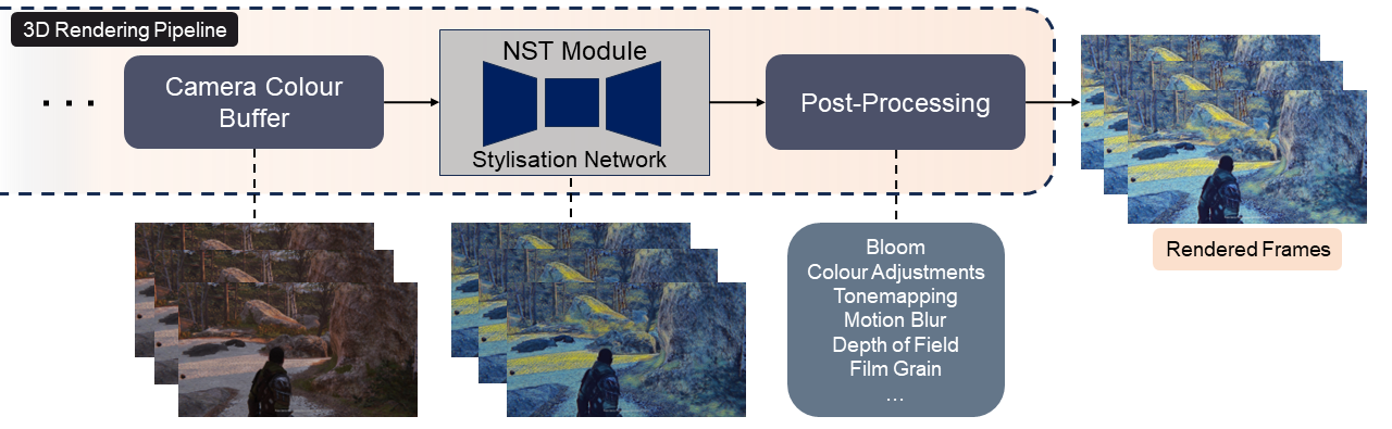 Neural Style Transfer (NST) research has been applied to images, videos, 3D meshes and radiance fields, but its application to 3D computer games remains relatively unexplored. Whilst image and video NST systems can be used as a post-processing effect for a computer game, this results in undesired artefacts and diminished post-processing effects. Here, we present an approach for injecting depth-aware NST as part of the 3D rendering pipeline. Qualitative and quantitative experiments are used to validate our in-game stylisation framework. We demonstrate temporally consistent results of artistically stylised game scenes, outperforming state-of-the-art image and video NST methods.