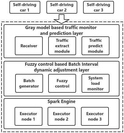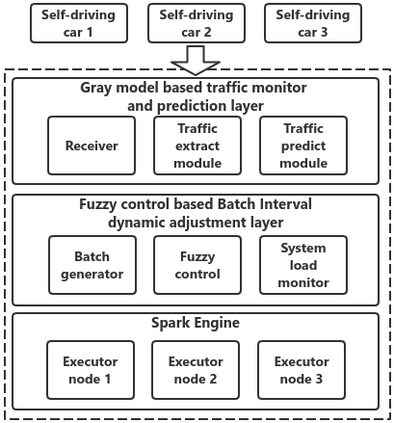 In recent years, with the rapid development of sensing technology and the Internet of Things (IoT), sensors play increasingly important roles in traffic control, medical monitoring, industrial production and etc. They generated high volume of data in a streaming way that often need to be processed in real time. Therefore, streaming data computing technology plays an indispensable role in the real-time processing of sensor data in high throughput but low latency. In view of the above problems, the proposed framework is implemented on top of Spark Streaming, which builds up a gray model based traffic flow monitor, a traffic prediction orientated prediction layer and a fuzzy control based Batch Interval dynamic adjustment layer for Spark Streaming. It could forecast the variation of sensors data arrive rate, make streaming Batch Interval adjustment in advance and implement real-time streaming process by edge. Therefore, it can realize the monitor and prediction of the data flow changes of the autonomous driving vehicle sensor data in geographical coverage of edge computing node area, meanwhile minimize the end-to-end latency but satisfy the application throughput requirements. The experiments show that it can predict short-term traffic with no more than 4% relative error in a whole day. By making batch consuming rate close to data generating rate, it can maintain system stability well even when arrival data rate changes rapidly. The Batch Interval can be converged to a suitable value in two minutes when data arrival rate is doubled. Compared with vanilla version Spark Streaming, where there has serious task accumulation and introduces large delay, it can reduce 35% latency by squeezing Batch Interval when data arrival rate is low; it also can significantly improve system throughput by only at most 25% Batch Interval increase when data arrival rate is high.
