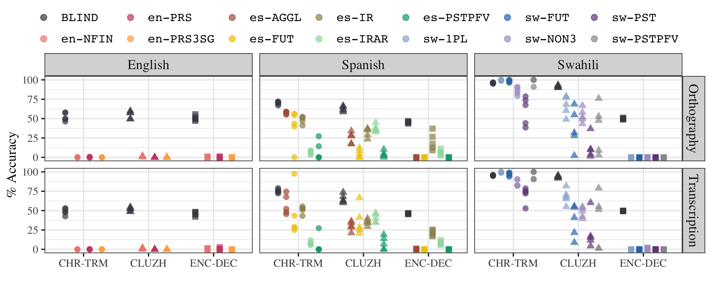 Modern work on the cross-linguistic computational modeling of morphological inflection has typically employed language-independent data splitting algorithms. In this paper, we supplement that approach with language-specific probes designed to test aspects of morphological generalization. Testing these probes on three morphologically distinct languages, English, Spanish, and Swahili, we find evidence that three leading morphological inflection systems employ distinct generalization strategies over conjugational classes and feature sets on both orthographic and phonologically transcribed inputs.