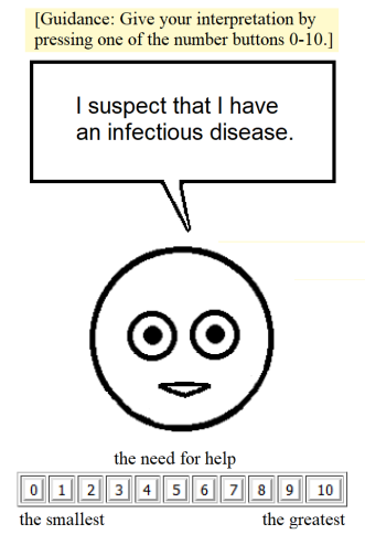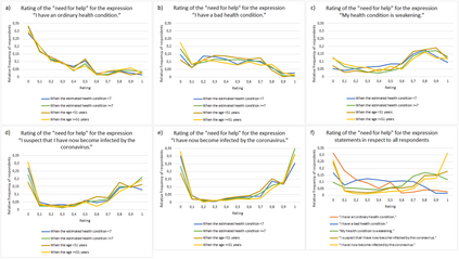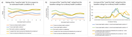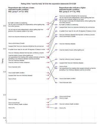 Developing machine learning models to support health analytics requires increased understanding about statistical properties of self-rated expression statements. We analyzed self-rated expression statements concerning the coronavirus COVID-19 epidemic to identify statistically significant differences between groups of respondents and to detect the patient's need for help with machine learning. Our quantitative study gathered the "need for help" ratings for twenty health-related expression statements concerning the coronavirus epidemic on a 11-point Likert scale, and nine answers about the person's health and wellbeing, sex and age. Online respondents between 30 May and 3 August 2020 were recruited from Finnish patient and disabled people's organizations, other health-related organizations and professionals, and educational institutions (n=673). We analyzed rating differences and dependencies with Kendall rank-correlation and cosine similarity measures and tests of Wilcoxon rank-sum, Kruskal-Wallis and one-way analysis of variance (ANOVA) between groups, and carried out machine learning experiments with a basic implementation of a convolutional neural network algorithm. We found statistically significant correlations and high cosine similarity values between various health-related expression statement pairs concerning the "need for help" ratings and a background question pair. We also identified statistically significant rating differences for several health-related expression statements in respect to groupings based on the answer values of background questions, such as the ratings of suspecting to have the coronavirus infection and having it depending on the estimated health condition, quality of life and sex. Our experiments with a convolutional neural network algorithm showed the applicability of machine learning to support detecting the need for help in the patient's expressions.