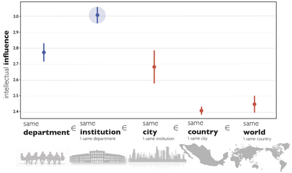 翻译:COVID-19大流行使得社会各级,包括大学和研究机构,都不得不进行社会疏远,提出了关于物理距离对于科学和学术进步的持续重要性的基本问题。利用针对科学家自己论文参考工作的知识影响的定制作者调查,加上对焦点和参考作品之间地理和语义距离的精确测量,我们发现在同一机构与科学家和学者出版作品的知识影响密切相关。然而,这种影响随着智力距离的增加而增加:同事在某个机构从事的参考工作越不同,对自身的影响就越大。世界各地的大学都是从事不同工作的人通过部门、委员会、研讨会和社区进行持续互动的地方。这些互动对他们所出版的研究产生了独特的影响,表明有必要取代而不是取代各种活动,以实现可持续进步。