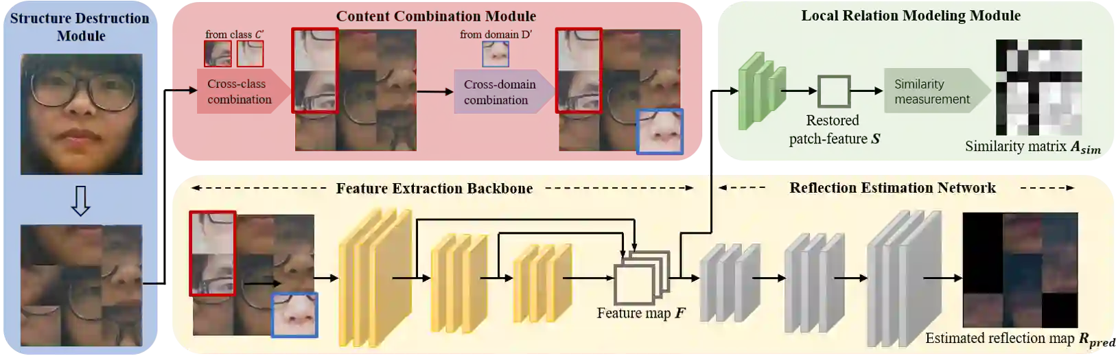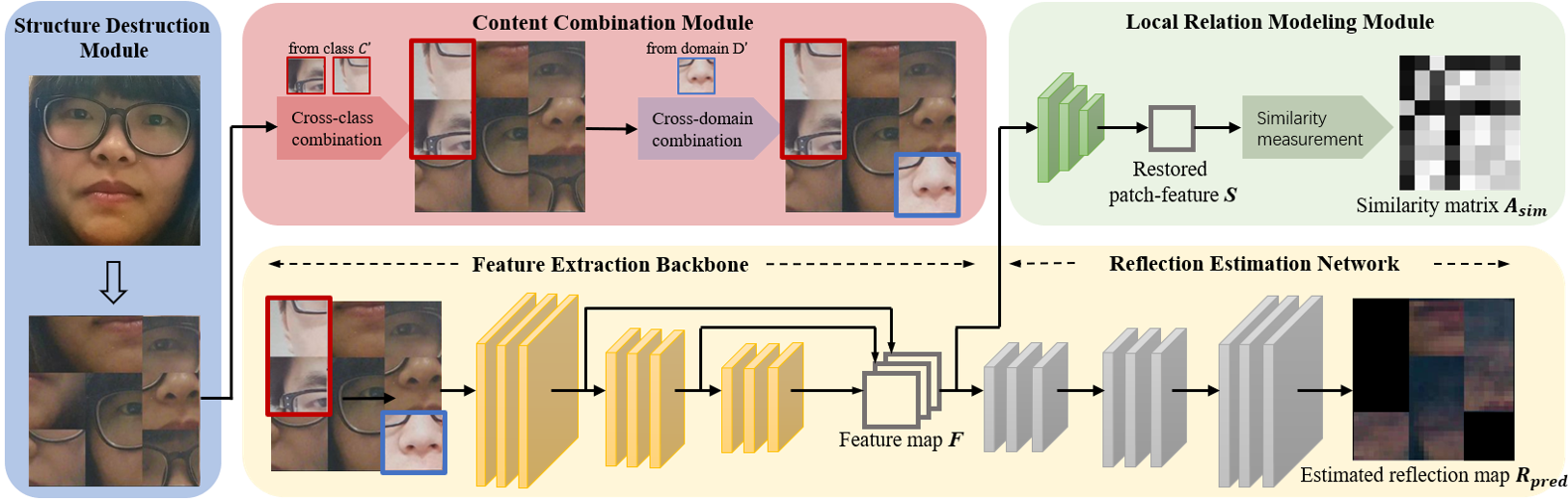 In pursuit of consolidating the face verification systems, prior face anti-spoofing studies excavate the hidden cues in original images to discriminate real persons and diverse attack types with the assistance of auxiliary supervision. However, limited by the following two inherent disturbances in their training process: 1) Complete facial structure in a single image. 2) Implicit subdomains in the whole dataset, these methods are prone to stick on memorization of the entire training dataset and show sensitivity to nonhomologous domain distribution. In this paper, we propose Structure Destruction Module and Content Combination Module to address these two imitations separately. The former mechanism destroys images into patches to construct a non-structural input, while the latter mechanism recombines patches from different subdomains or classes into a mixup construct. Based on this splitting-and-splicing operation, Local Relation Modeling Module is further proposed to model the second-order relationship between patches. We evaluate our method on extensive public datasets and promising experimental results to demonstrate the reliability of our method against state-of-the-art competitors.