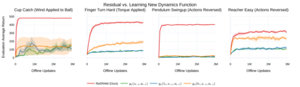 Simulation-to-reality reinforcement learning (RL) faces the critical challenge of reconciling discrepancies between simulated and real-world dynamics, which can severely degrade agent performance. A promising approach involves learning corrections to simulator forward dynamics represented as a residual error function, however this operation is impractical with high-dimensional states such as images. To overcome this, we propose ReDRAW, a latent-state autoregressive world model pretrained in simulation and calibrated to target environments through residual corrections of latent-state dynamics rather than of explicit observed states. Using this adapted world model, ReDRAW enables RL agents to be optimized with imagined rollouts under corrected dynamics and then deployed in the real world. In multiple vision-based MuJoCo domains and a physical robot visual lane-following task, ReDRAW effectively models changes to dynamics and avoids overfitting in low data regimes where traditional transfer methods fail.