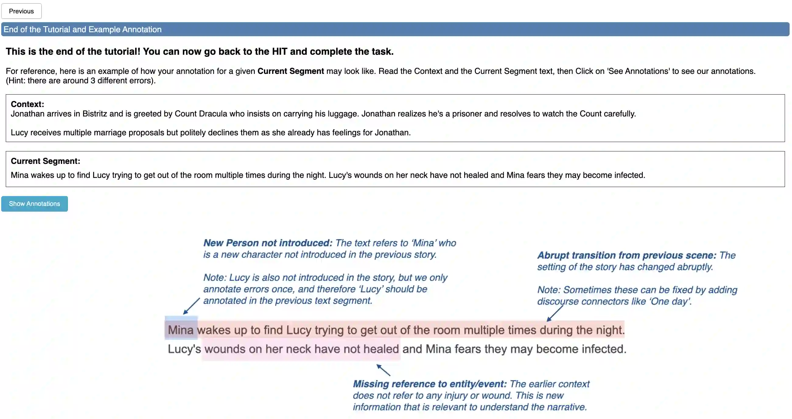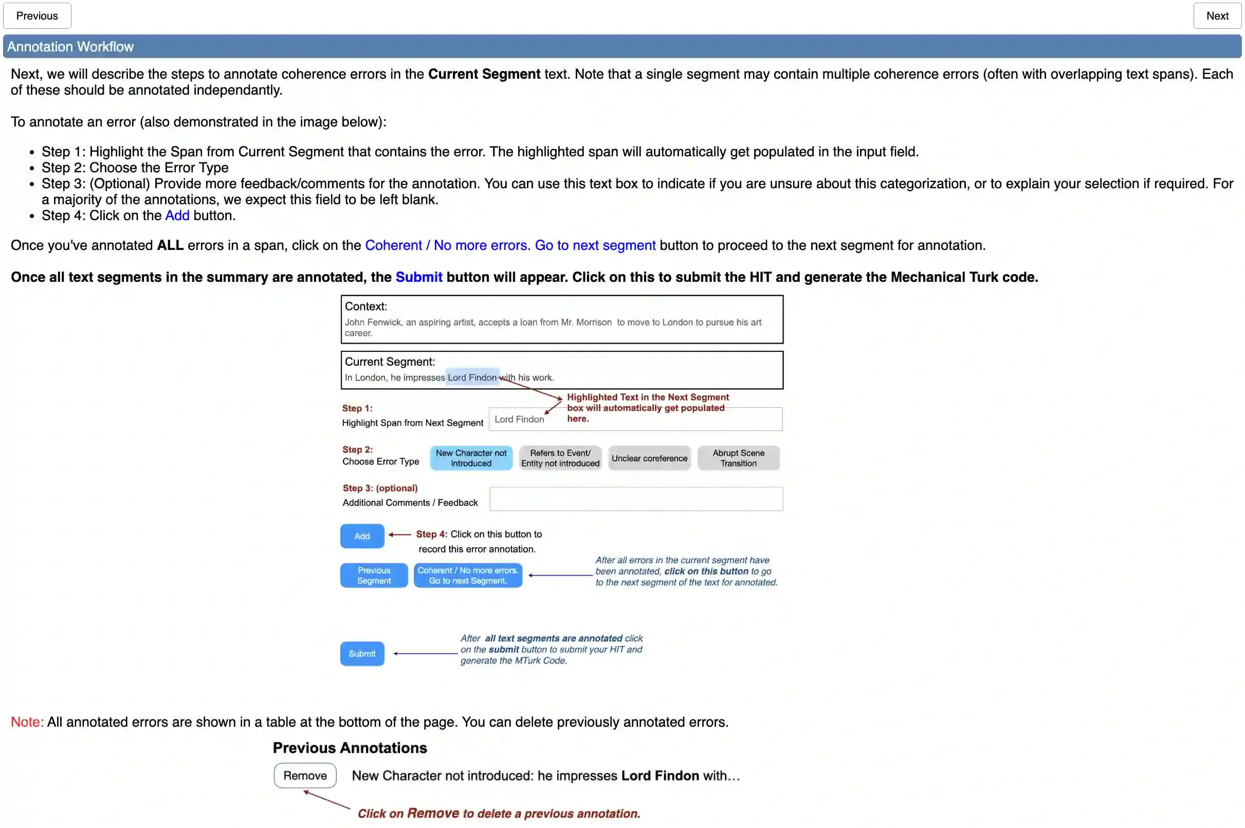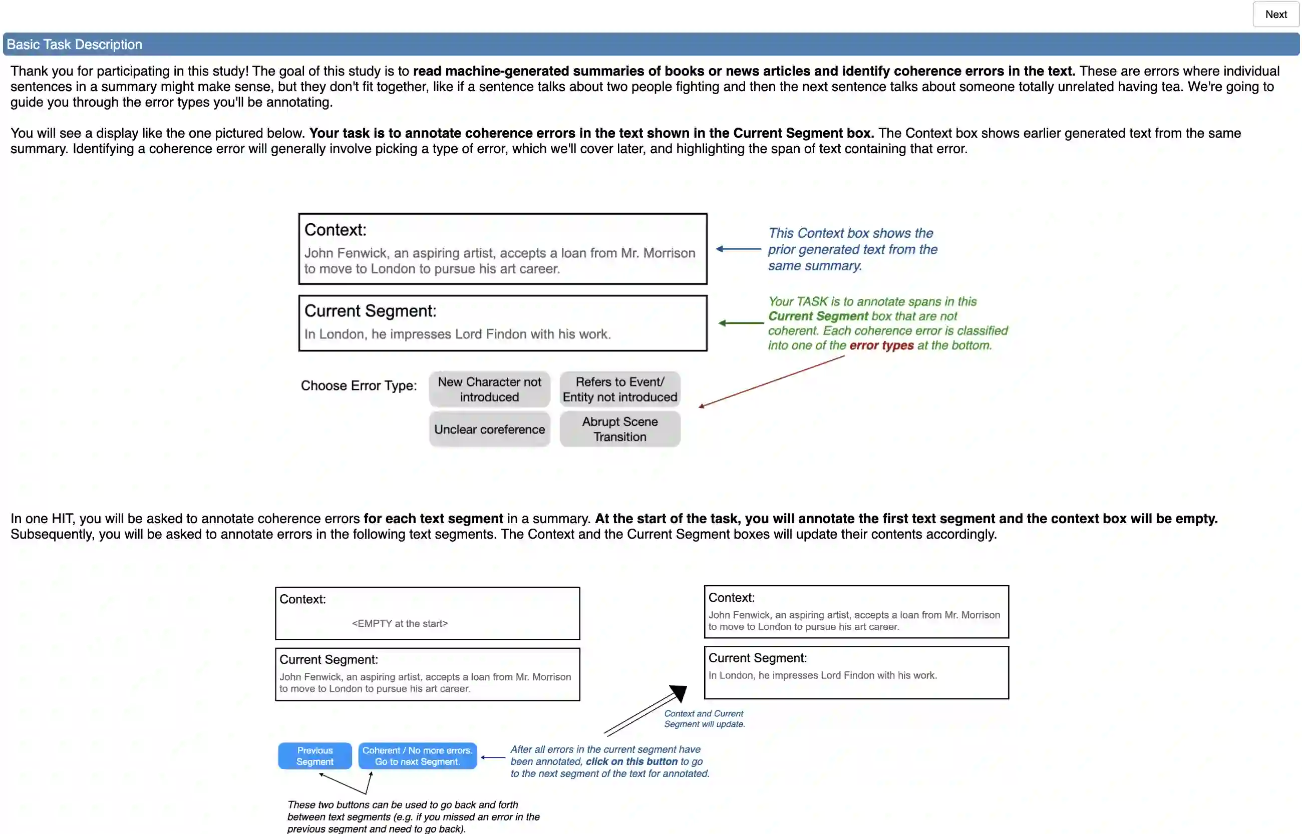 翻译:由于缺乏适当的评价框架,无法在总结长篇案文方面取得进展。当必须编写长篇摘要以适当涵盖该案文的各个方面时,该摘要需要提出一种连贯的说明,读者才能理解,但目前的自动和人文评价方法无法找出一致性方面的缺陷。在这项工作中,我们引入了SNAC, 这是一种叙述一致性评价框架,其根源在于细微的长篇说明;我们开发了生成的叙述性摘要中的一致性错误分类,收集了150本书和电影剧本摘要中6.6k句的跨层次说明。我们的工作首次描述了由最先进的总结模型产生的一致性错误,以及征求人群说明者作出一致性判断的程序。此外,我们表明,所收集的说明使我们能够培训强有力的分类人员,以便在生成的摘要中将一致性错误自动本地化,并将过去在一致性模型中的工作基准化。最后,我们的SNAC框架可以支持今后在长篇总结和一致性评价方面的工作,包括改进的总结模型和后摘要校正。
