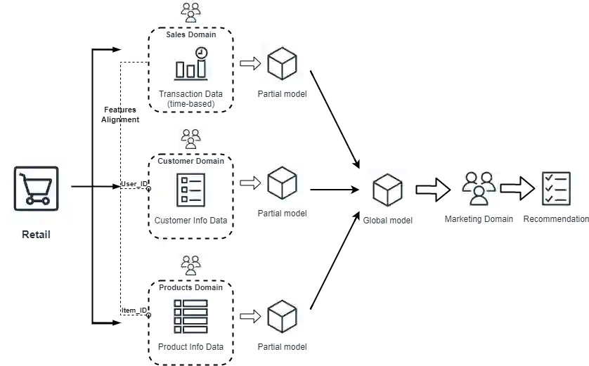 The evolution of data architecture has seen the rise of data lakes, aiming to solve the bottlenecks of data management and promote intelligent decision-making. However, this centralized architecture is limited by the proliferation of data sources and the growing demand for timely analysis and processing. A new data paradigm, Data Mesh, is proposed to overcome these challenges. Data Mesh treats domains as a first-class concern by distributing the data ownership from the central team to each data domain, while keeping the federated governance to monitor domains and their data products. Many multi-million dollar organizations like Paypal, Netflix, and Zalando have already transformed their data analysis pipelines based on this new architecture. In this decentralized architecture where data is locally preserved by each domain team, traditional centralized machine learning is incapable of conducting effective analysis across multiple domains, especially for security-sensitive organizations. To this end, we introduce a pioneering approach that incorporates Federated Learning into Data Mesh. To the best of our knowledge, this is the first open-source applied work that represents a critical advancement toward the integration of federated learning methods into the Data Mesh paradigm, underscoring the promising prospects for privacy-preserving and decentralized data analysis strategies within Data Mesh architecture.