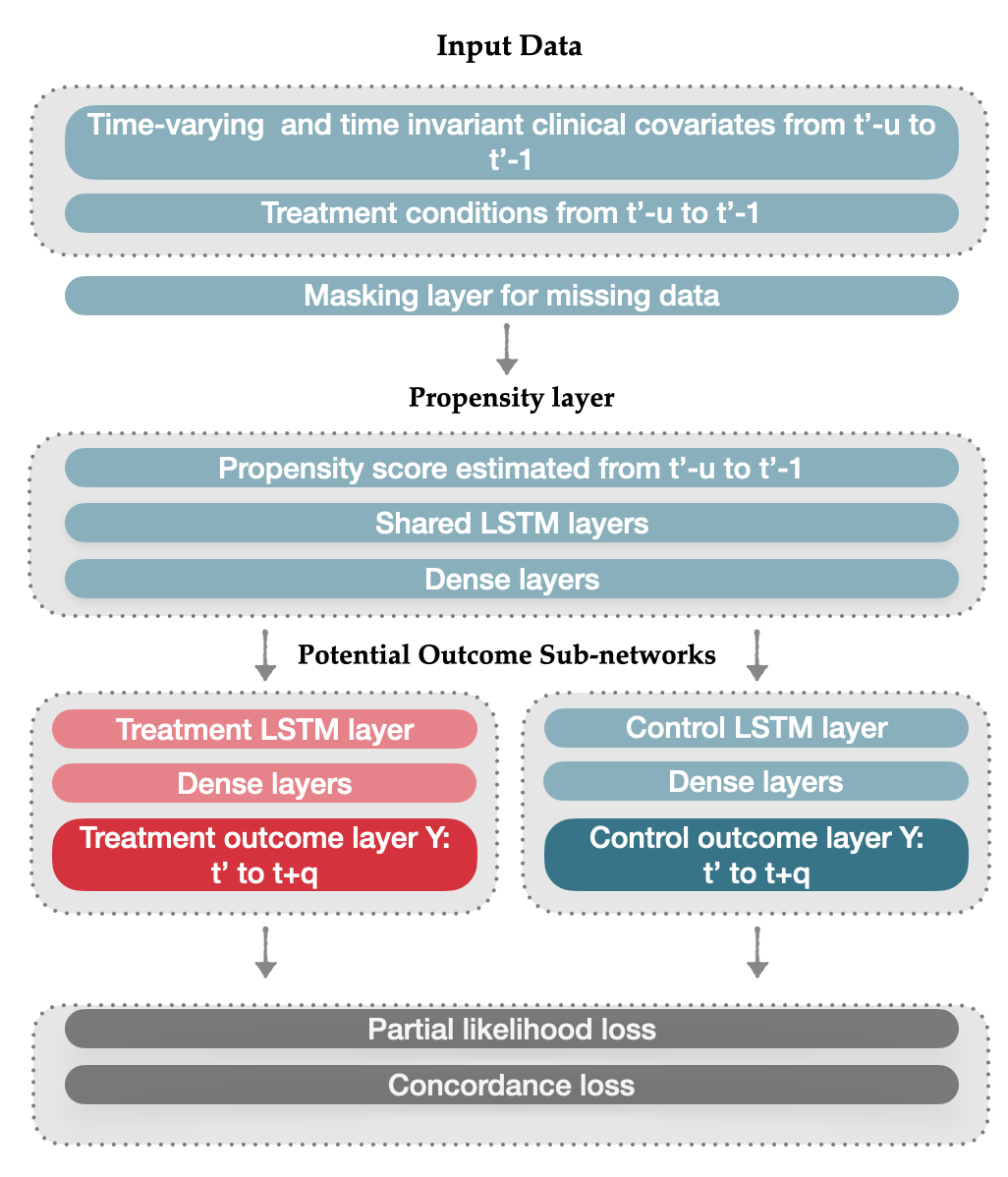 翻译:纵向观测健康数据的因果推断往往要求准确估计治疗对时间到活动结果的影响,同时有时间变化的共差。为了解决这一连续治疗效果估计问题,我们开发了一个因果动态生存模型(CDS),利用潜在结果框架,与经常的子网络一起使用随机种子集合的随机子网络来估计其信任期生存曲线的差异。使用模拟生存数据集,CDS模型显示了良好的因果效果估计,在抽样规模、事件率、混杂和重叠等不同情景中,估计了因果效果。然而,增加样本规模对于减轻高度混杂的不利影响并不有效。在两个大型临床群研究中,我们模型确定了预期的有条件平均治疗效果,并检测出在时间和病人分组中的个体效应。CDS提供了个性绝对治疗效果估计,以改善临床决定。