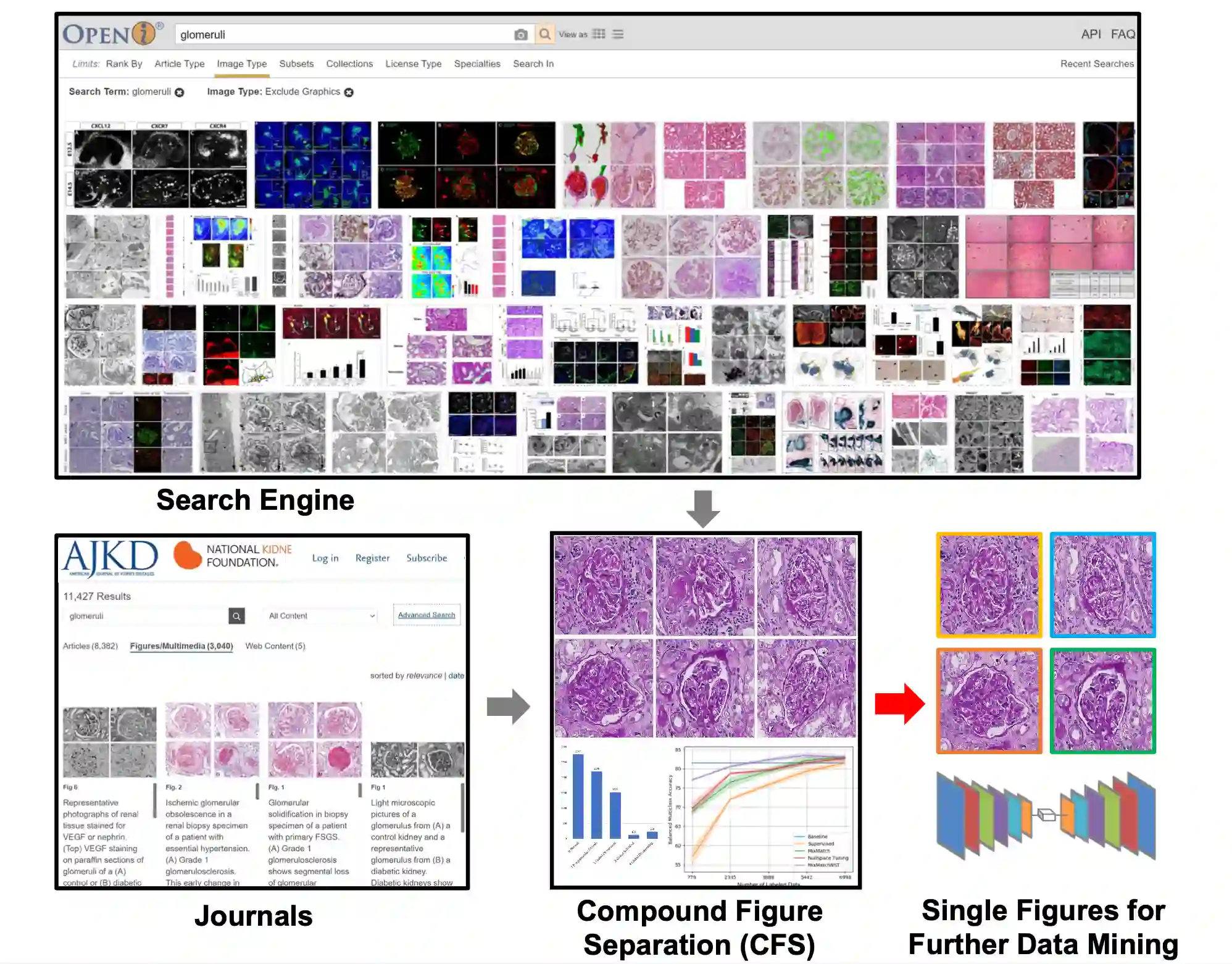 With the rapid development of self-supervised learning (e.g., contrastive learning), the importance of having large-scale images (even without annotations) for training a more generalizable AI model has been widely recognized in medical image analysis. However, collecting large-scale task-specific unannotated data at scale can be challenging for individual labs. Existing online resources, such as digital books, publications, and search engines, provide a new resource for obtaining large-scale images. However, published images in healthcare (e.g., radiology and pathology) consist of a considerable amount of compound figures with subplots. In order to extract and separate compound figures into usable individual images for downstream learning, we propose a simple compound figure separation (SimCFS) framework without using the traditionally required detection bounding box annotations, with a new loss function and a hard case simulation. Our technical contribution is four-fold: (1) we introduce a simulation-based training framework that minimizes the need for resource extensive bounding box annotations; (2) we propose a new side loss that is optimized for compound figure separation; (3) we propose an intra-class image augmentation method to simulate hard cases; and (4) to the best of our knowledge, this is the first study that evaluates the efficacy of leveraging self-supervised learning with compound image separation. From the results, the proposed SimCFS achieved state-of-the-art performance on the ImageCLEF 2016 Compound Figure Separation Database. The pretrained self-supervised learning model using large-scale mined figures improved the accuracy of downstream image classification tasks with a contrastive learning algorithm. The source code of SimCFS is made publicly available at https://github.com/hrlblab/ImageSeperation.