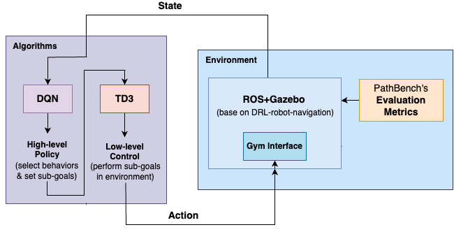This paper presents a hierarchical path-planning and control framework that combines a high-level Deep Q-Network (DQN) for discrete sub-goal selection with a low-level Twin Delayed Deep Deterministic Policy Gradient (TD3) controller for continuous actuation. The high-level module selects behaviors and sub-goals; the low-level module executes smooth velocity commands. We design a practical reward shaping scheme (direction, distance, obstacle avoidance, action smoothness, collision penalty, time penalty, and progress), together with a LiDAR-based safety gate that prevents unsafe motions. The system is implemented in ROS + Gazebo (TurtleBot3) and evaluated with PathBench metrics, including success rate, collision rate, path efficiency, and re-planning efficiency, in dynamic and partially observable environments. Experiments show improved success rate and sample efficiency over single-algorithm baselines (DQN or TD3 alone) and rule-based planners, with better generalization to unseen obstacle configurations and reduced abrupt control changes. Code and evaluation scripts are available at the project repository.